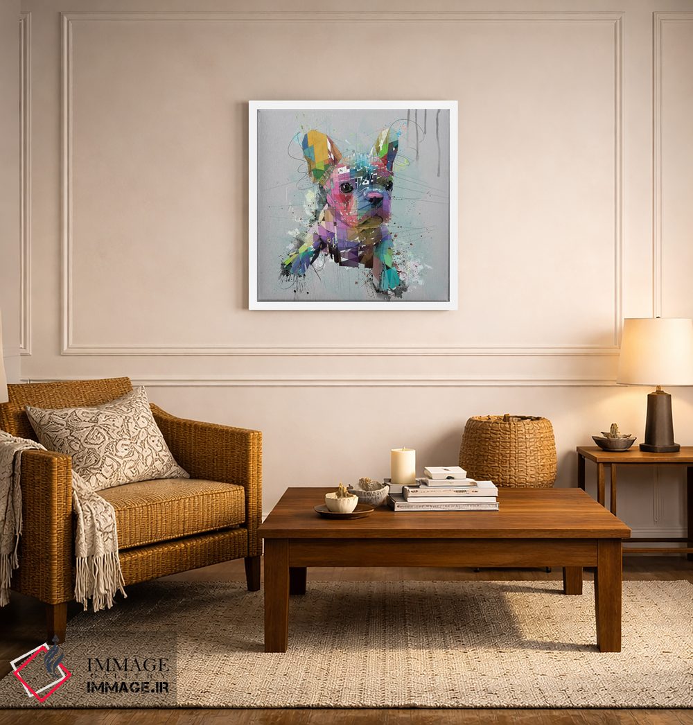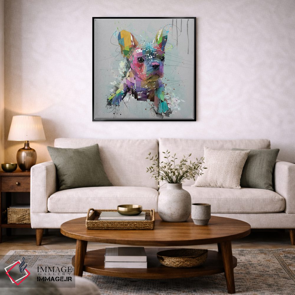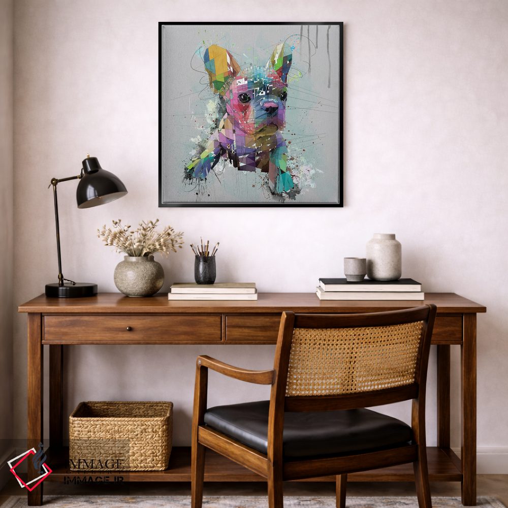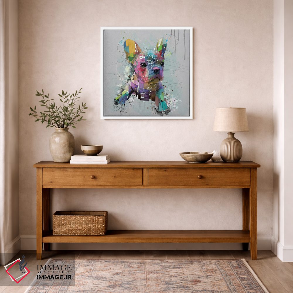 اگر میخواهید دیوار کمی سرزندگیِ محترمانه داشته باشد، «توله بولداگ فرانسوی روی پسزمینه خاکستری» اثرِ «کاتیا اسکای» گرما و شخصیت به فضا اضافه میکند، برای دیوار کنار میز کار گزینهٔ مناسبیست. با نورپردازی نقطهای، جذابتر هم میشود.