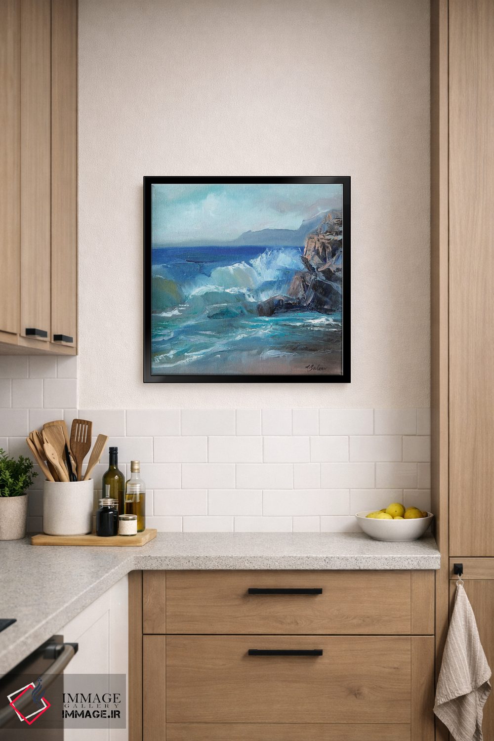 براساس پالت ترکیبی اثر، قاب تیک گرم (چوبی) پیشنهاد اول است و مشکی مات (فریم متوسط) مکمل. برای سفارشهای پروژهای با ابعاد و قابهای اختصاصی با ایماژ در تماس باشید.