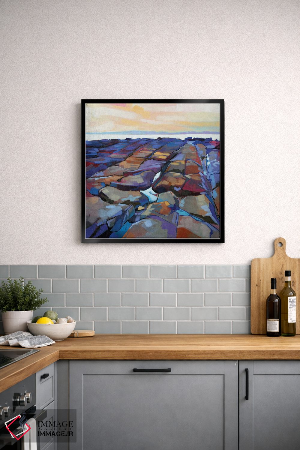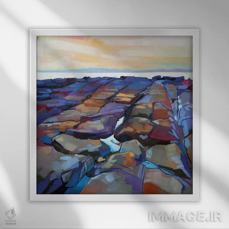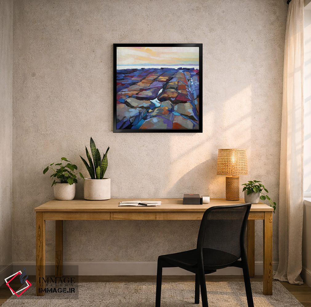 براساس پالت ترکیبی اثر، قاب تیک گرم (چوبی) پیشنهاد اول است و مشکی مات (فریم متوسط) مکمل. برای سفارشهای پروژهای با ابعاد و قابهای اختصاصی با ایماژ در تماس باشید.