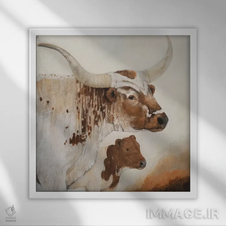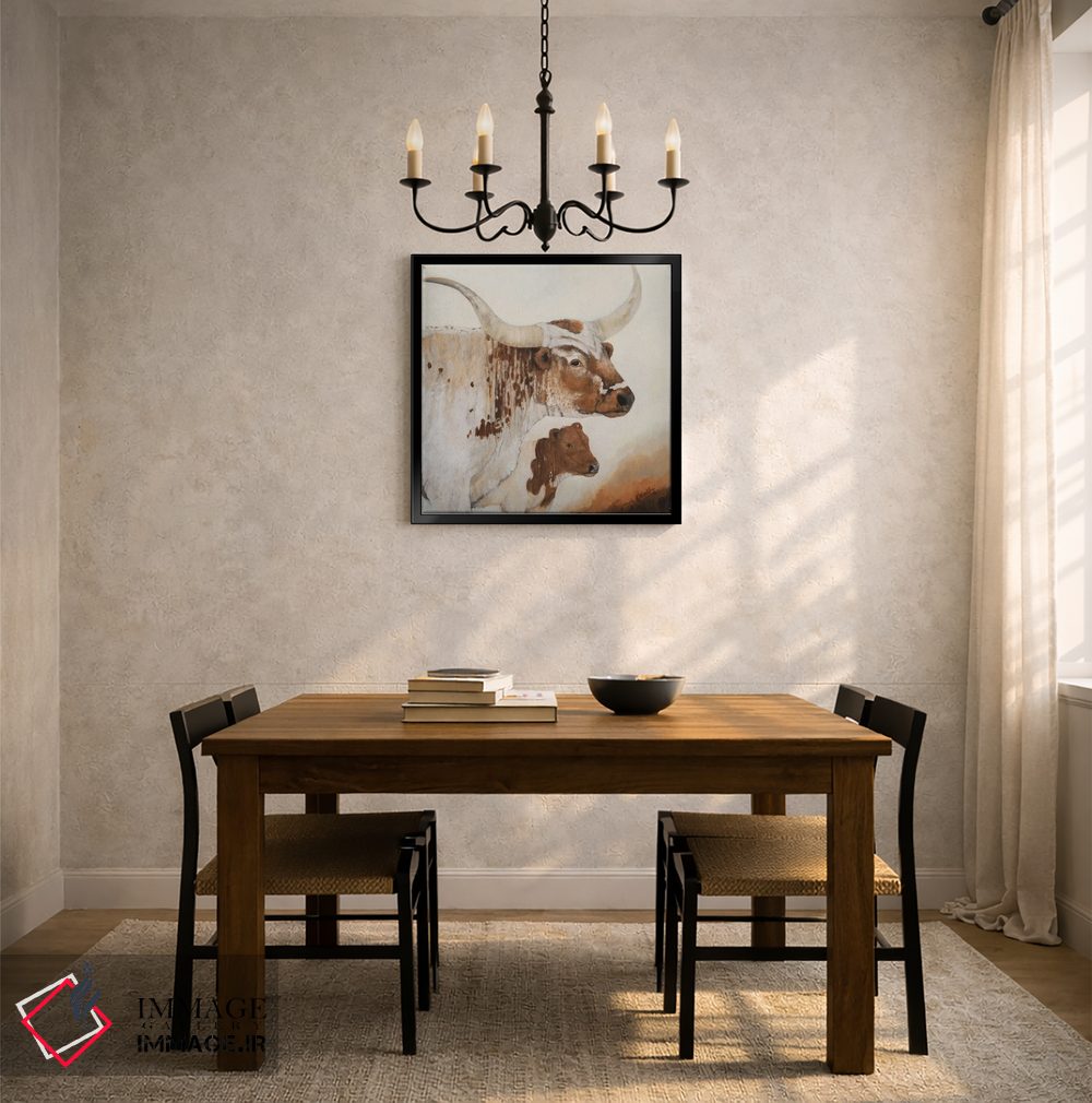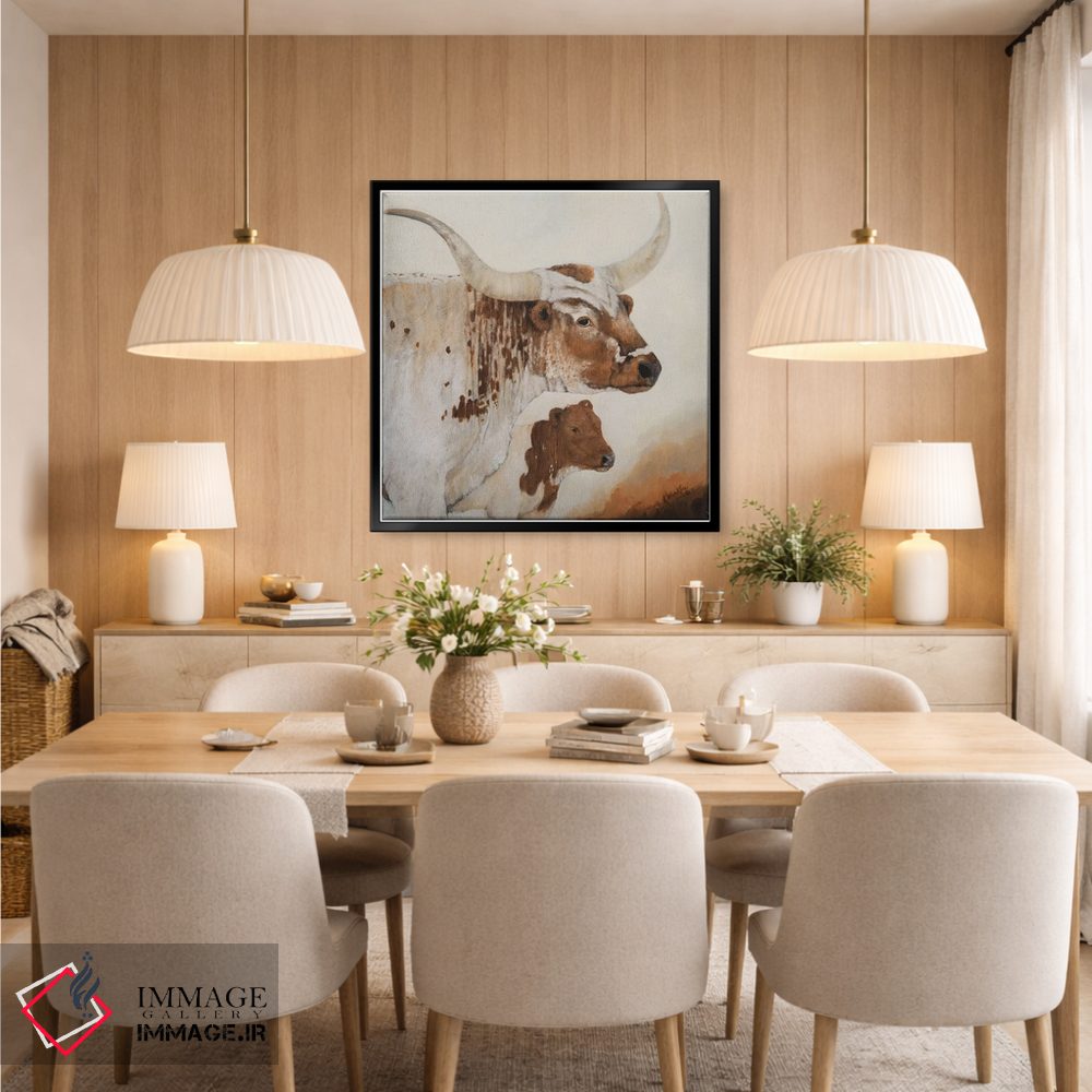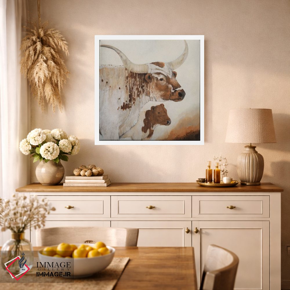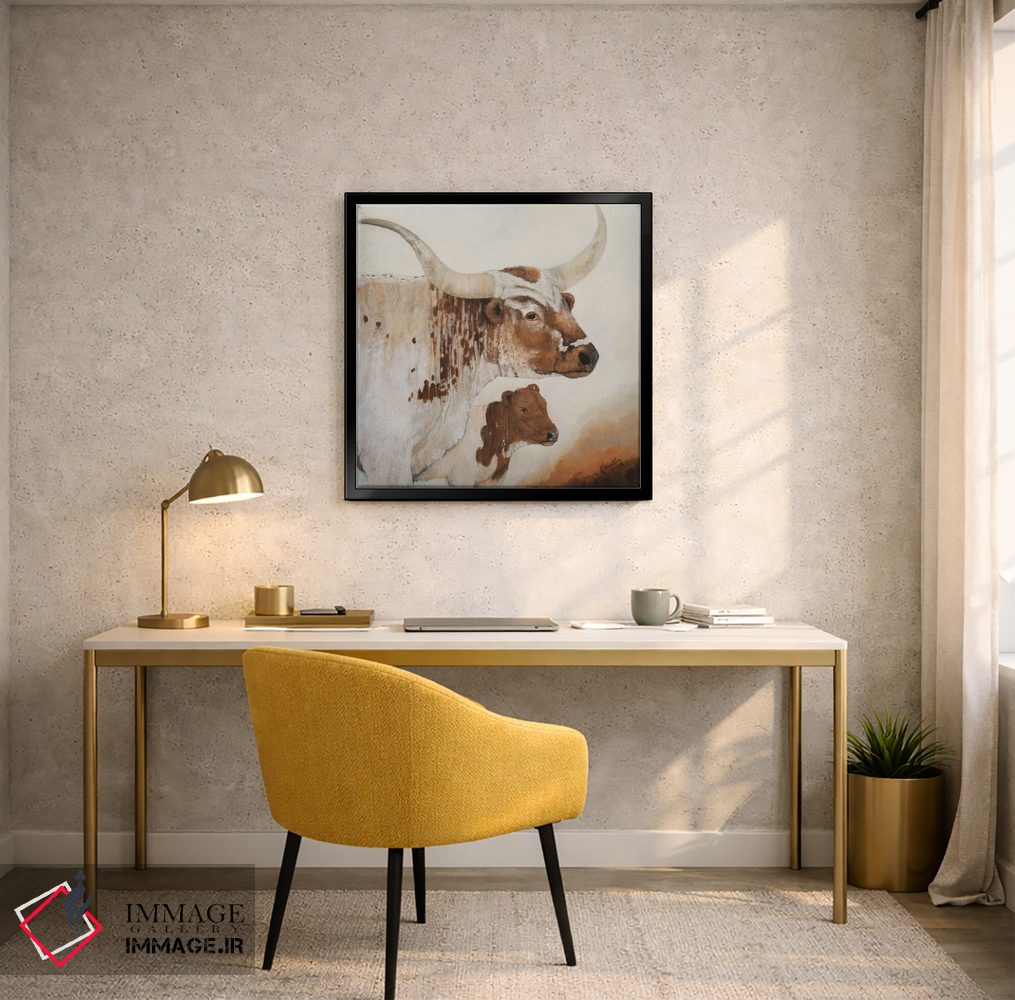 براساس پالت گرم اثر، قاب بلوط روشن (چوبی) پیشنهاد اول است و استخوانی ملایم مکمل. برای سفارشهای پروژهای با ابعاد و قابهای اختصاصی با ایماژ در تماس باشید.