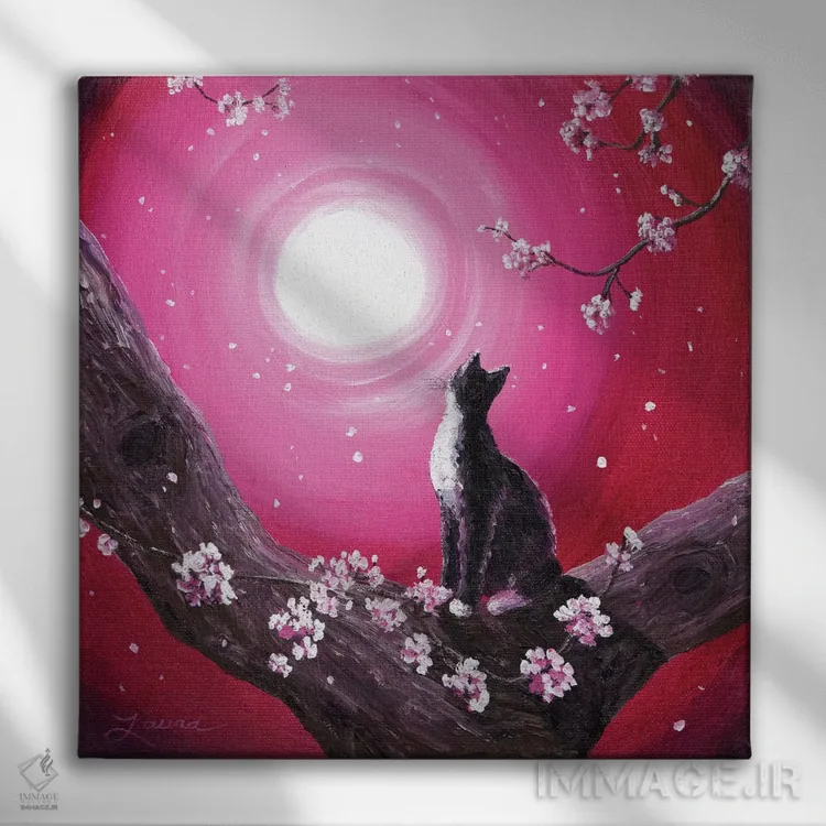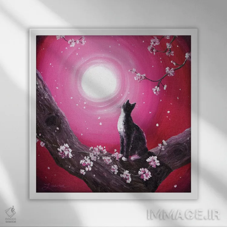 تابلو دکوراتیو گربه توکسیدو میان شکوفه های گیلاس اثر لورا ایورسن