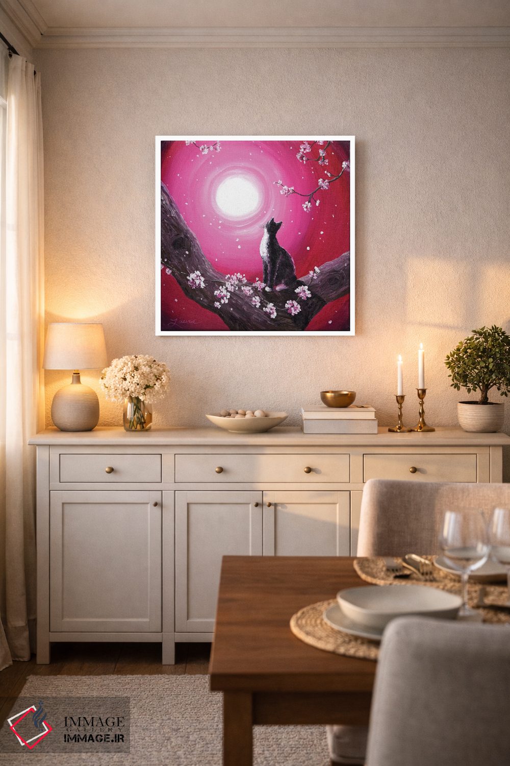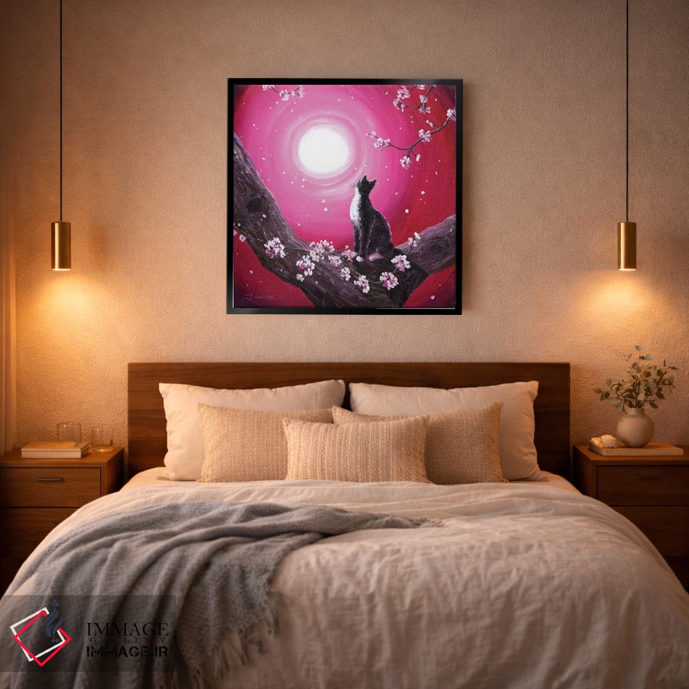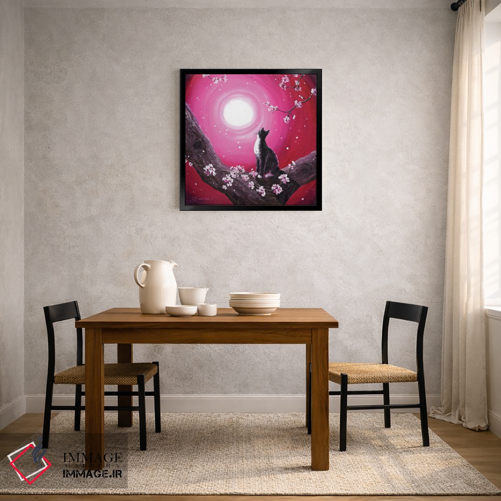 «گربه توکسیدو میان شکوفههای گیلاس» اثرِ «لورا ایورسن» از آن کارهاییست که به فضا، گرمیِ ملایم اضافه میکند؛ برای اتاق کودک (بدون لحن کودکانه) انتخاب خوبیست. در کنار گیاهان و نور طبیعی، جذابتر هم میشود.