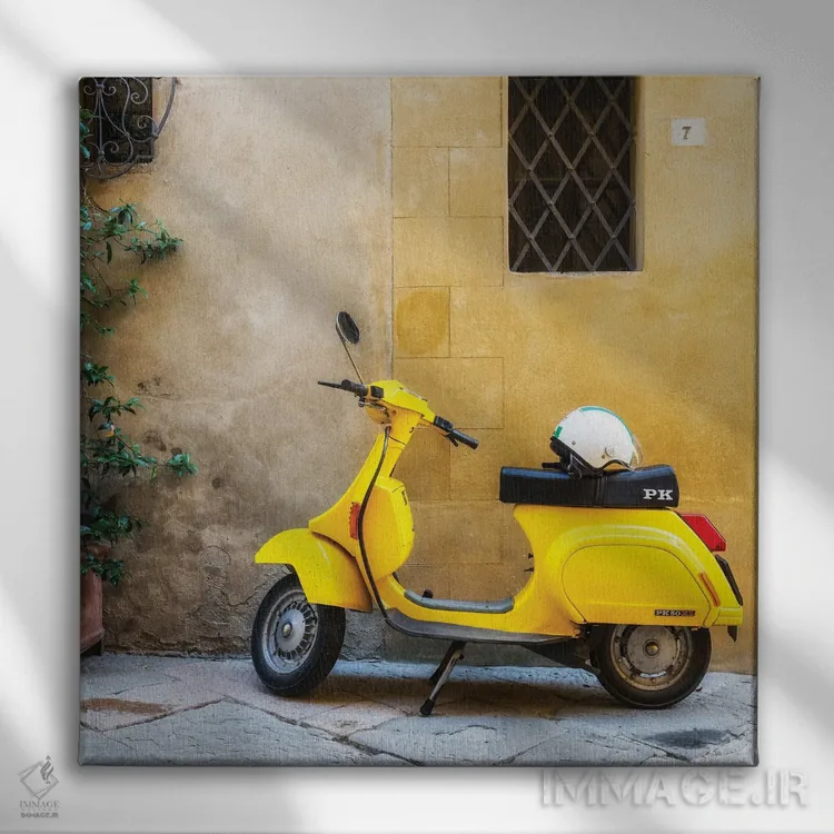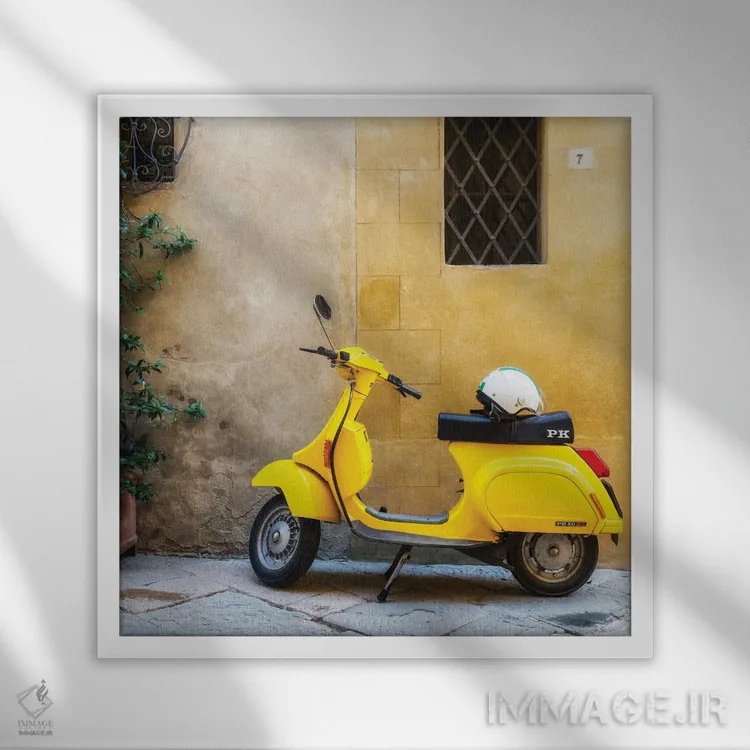 این تابلو با عنوان «وسپا (موتور سیکلت)» اثرِ «میکولاج گوسپودرک» به دیوار، شخصیت و جهت میدهد؛ برای راهروها و ورودیهای مینیمال پیشنهاد میشود. با نور گرم یا سرد، خوانایی و وقارش را حفظ میکند.
