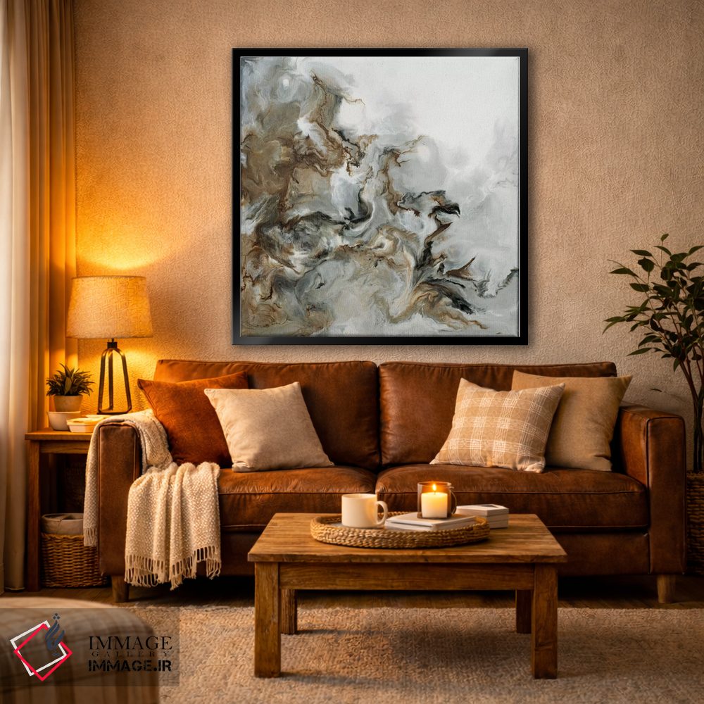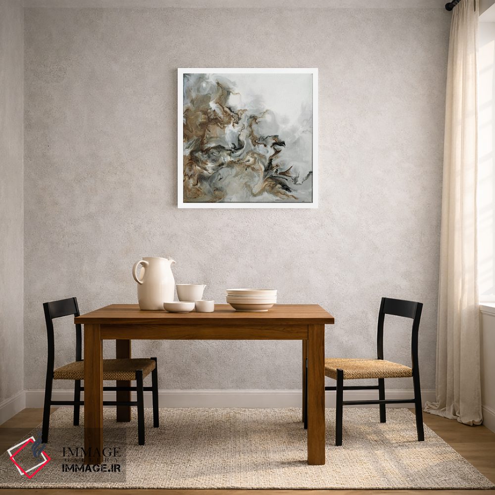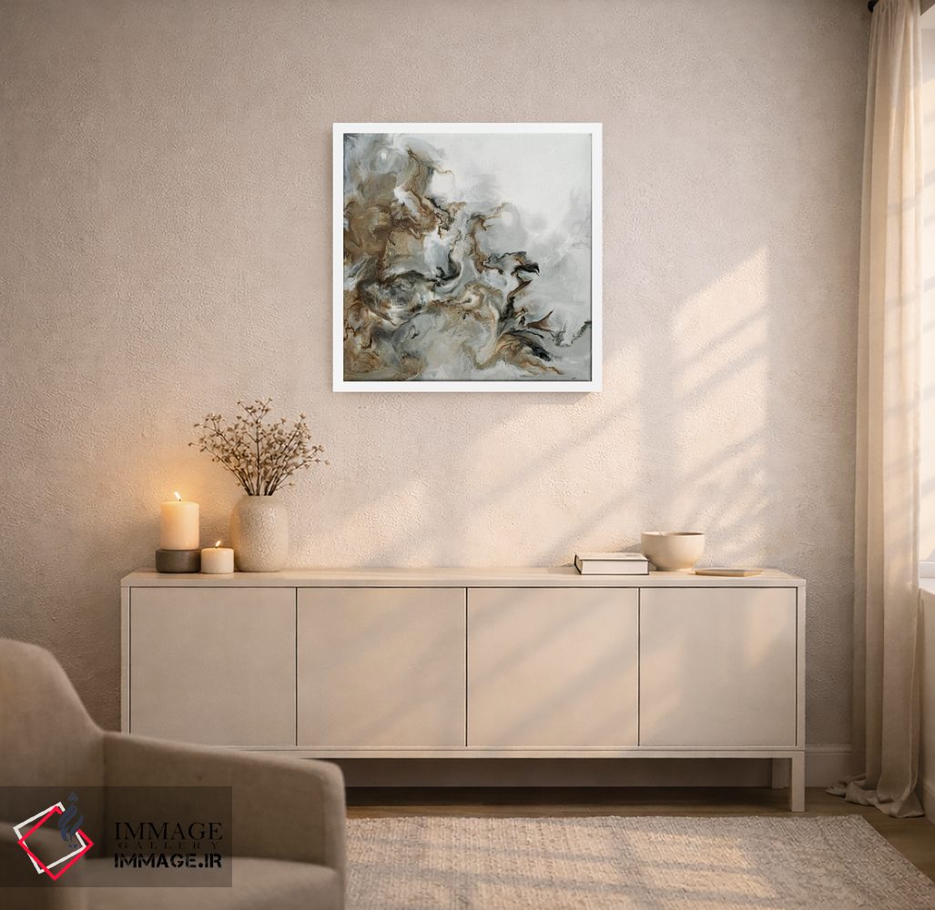 براساس پالت گرم اثر، قاب بلوط روشن (چوبی) پیشنهاد اول است و استخوانی ملایم مکمل. برای سفارشهای پروژهای با ابعاد و قابهای اختصاصی با ایماژ در تماس باشید.