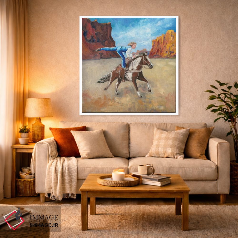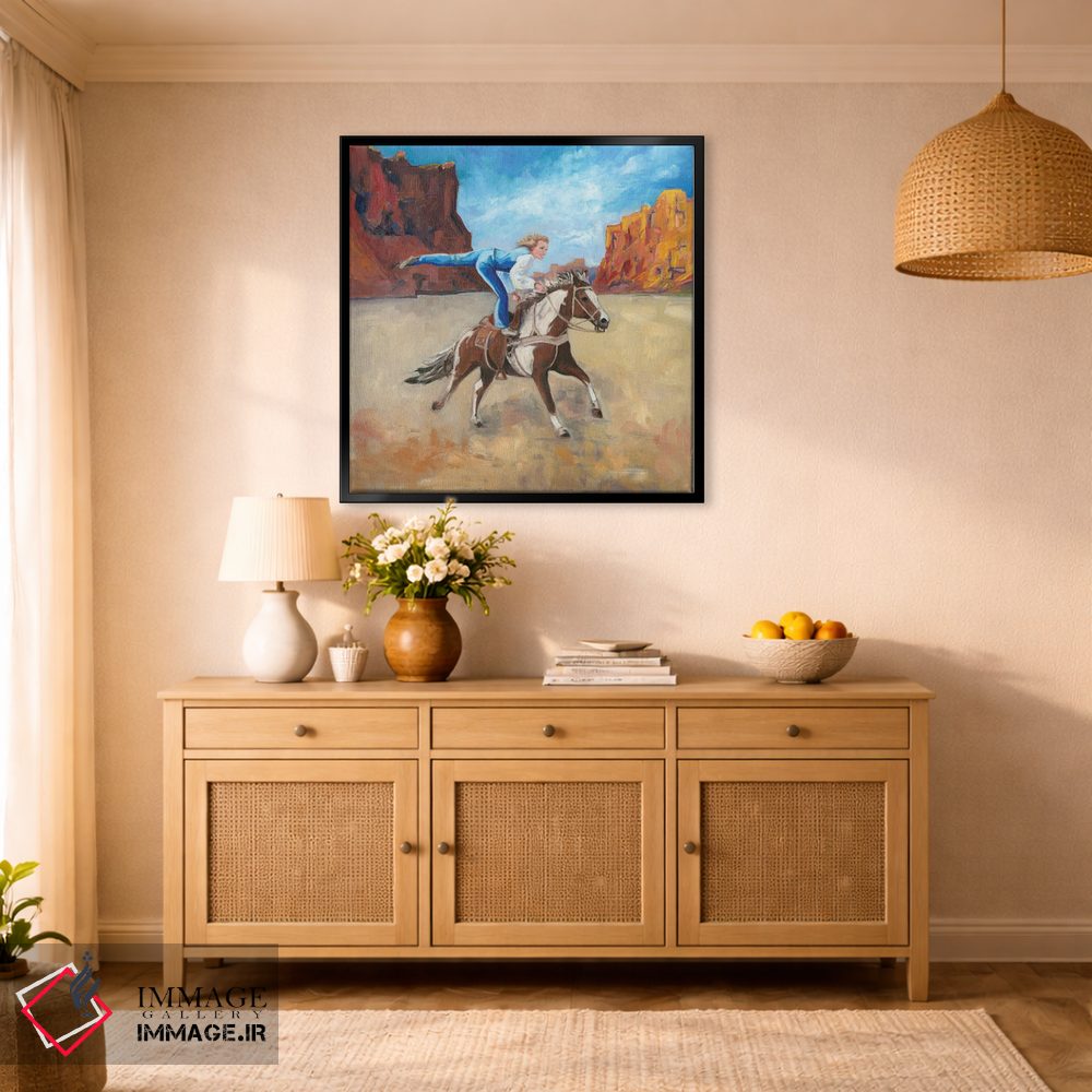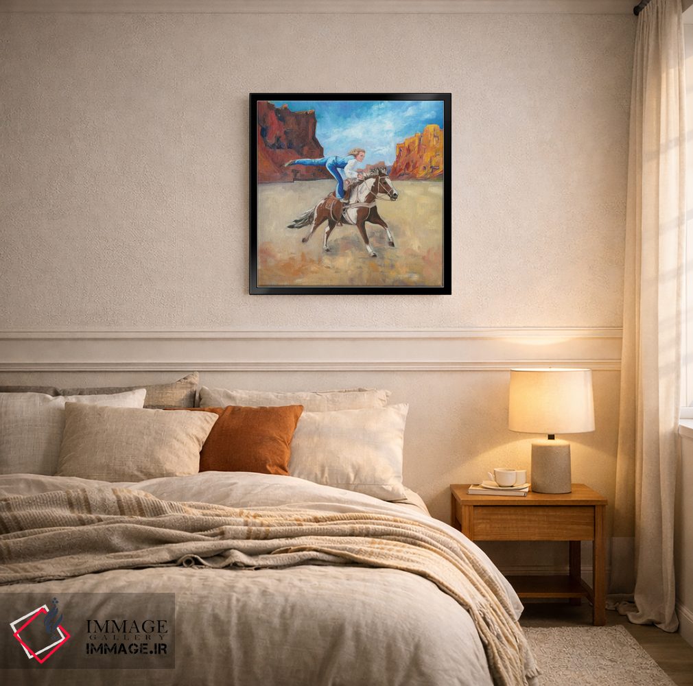 براساس پالت ترکیبی اثر، قاب تیک گرم (چوبی) پیشنهاد اول است و مشکی مات (فریم متوسط) مکمل. برای سفارشهای پروژهای با ابعاد و قابهای اختصاصی با ایماژ در تماس باشید.