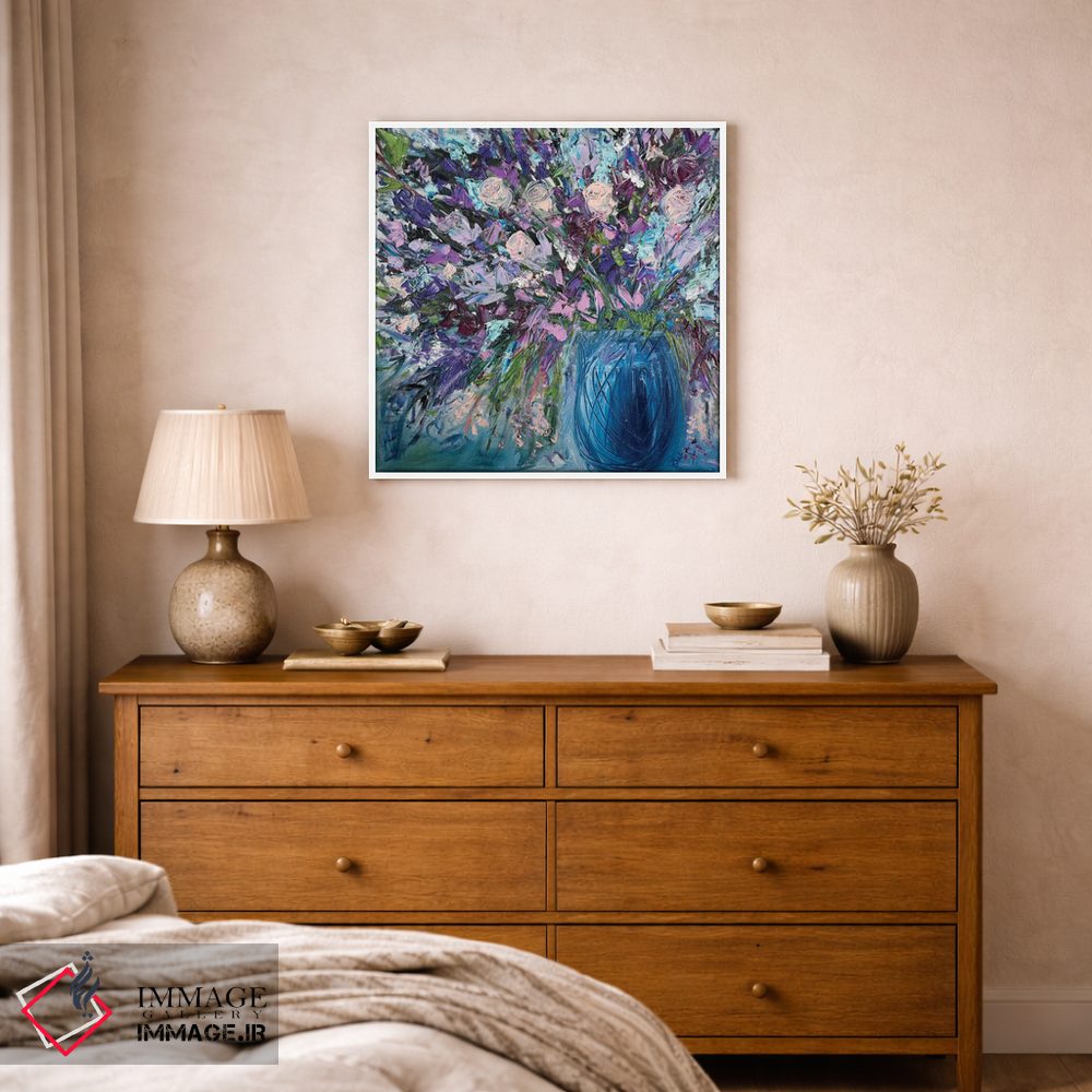 اگر دوست دارید دیوار روشنتر و آرامتر دیده شود، «رزهای ابریشمی» اثرِ «شالیمار لگاسپی» چیدمان را از خشکی بیرون میآورد، برای نشیمنهای روشن گزینهٔ مناسبیست. در کنار گیاهان آپارتمانی، هماهنگتر هم میشود.