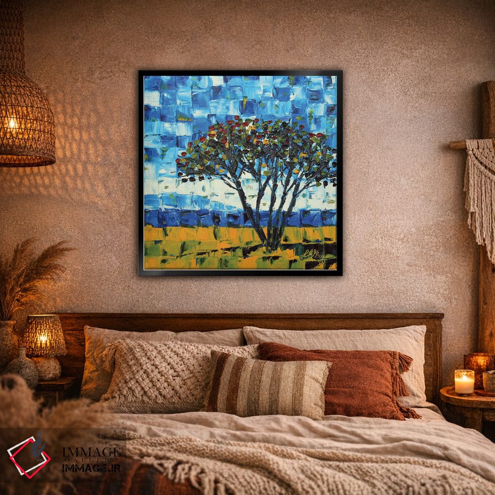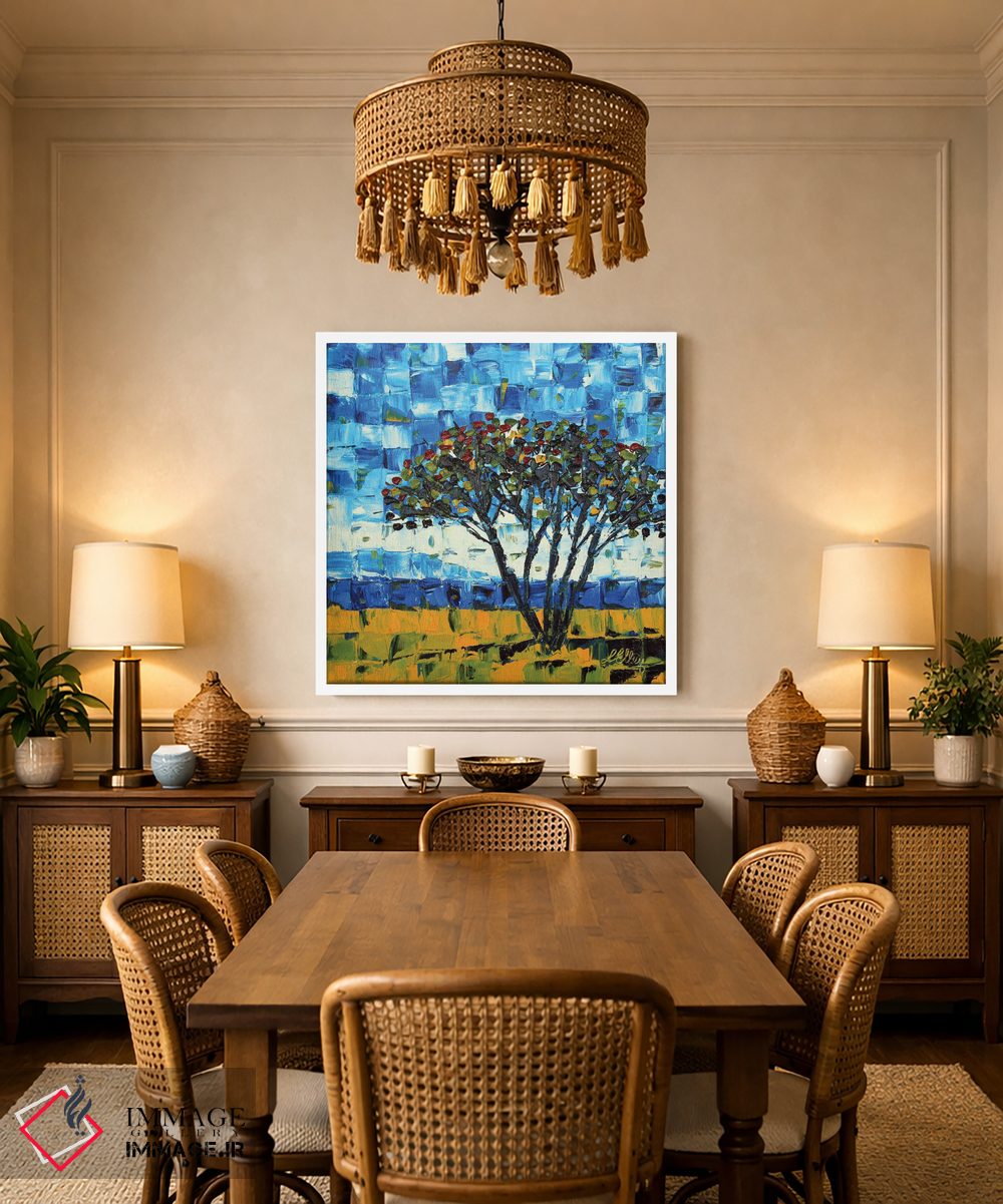 در «درخت پوهوکاکاوا نیوزیلند» اثرِ «لیزا الی»، ریتم بصری به چشم میآید؛ مناسب برای دیوار شاخص کنار مبلمان ساده.