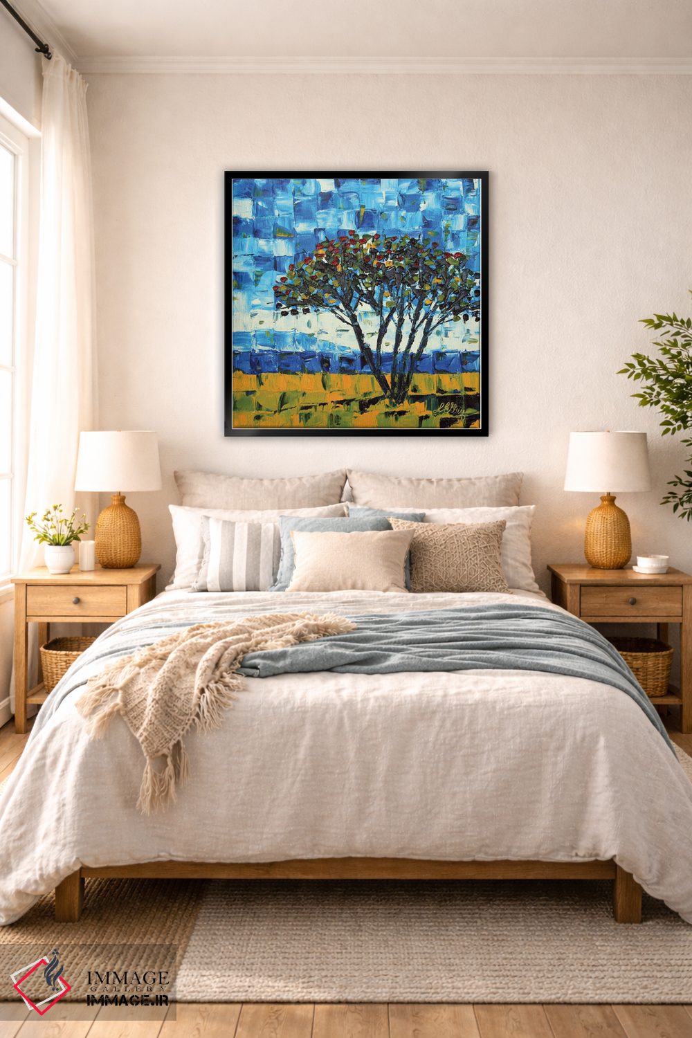 براساس پالت ترکیبی اثر، قاب تیک گرم (چوبی) پیشنهاد اول است و مشکی مات (فریم متوسط) مکمل. برای سفارشهای پروژهای با ابعاد و قابهای اختصاصی با ایماژ در تماس باشید.