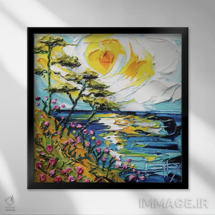 براساس پالت ترکیبی اثر، قاب تیک گرم (چوبی) پیشنهاد اول است و مشکی مات (فریم متوسط) مکمل. برای سفارشهای پروژهای با ابعاد و قابهای اختصاصی با ایماژ در تماس باشید.