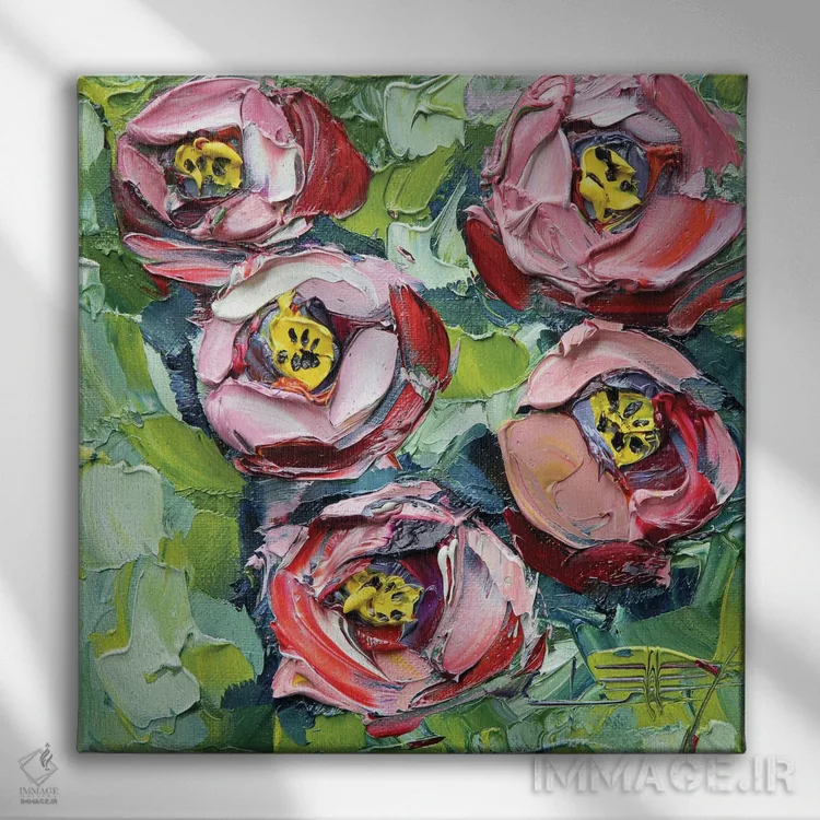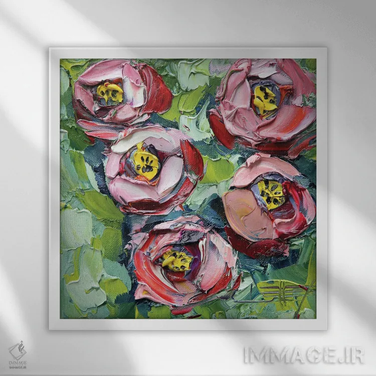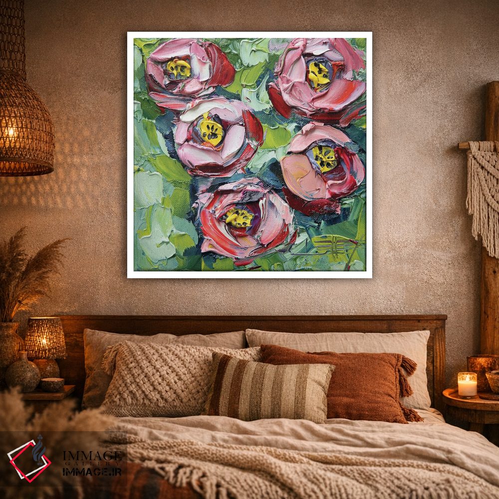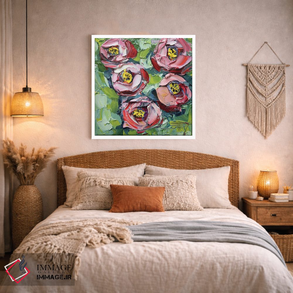 برای دیواری که میخواهید نرمتر دیده شود، «گل صدتومانی» اثرِ «لیزا الی» جزئیات نزدیک را چشمنواز نشان میدهد؛ برای فضای غذاخوری انتخابی خوشسلیقه است. فضا را شلوغ نمیکند؛ فقط لطیفترش میکند.