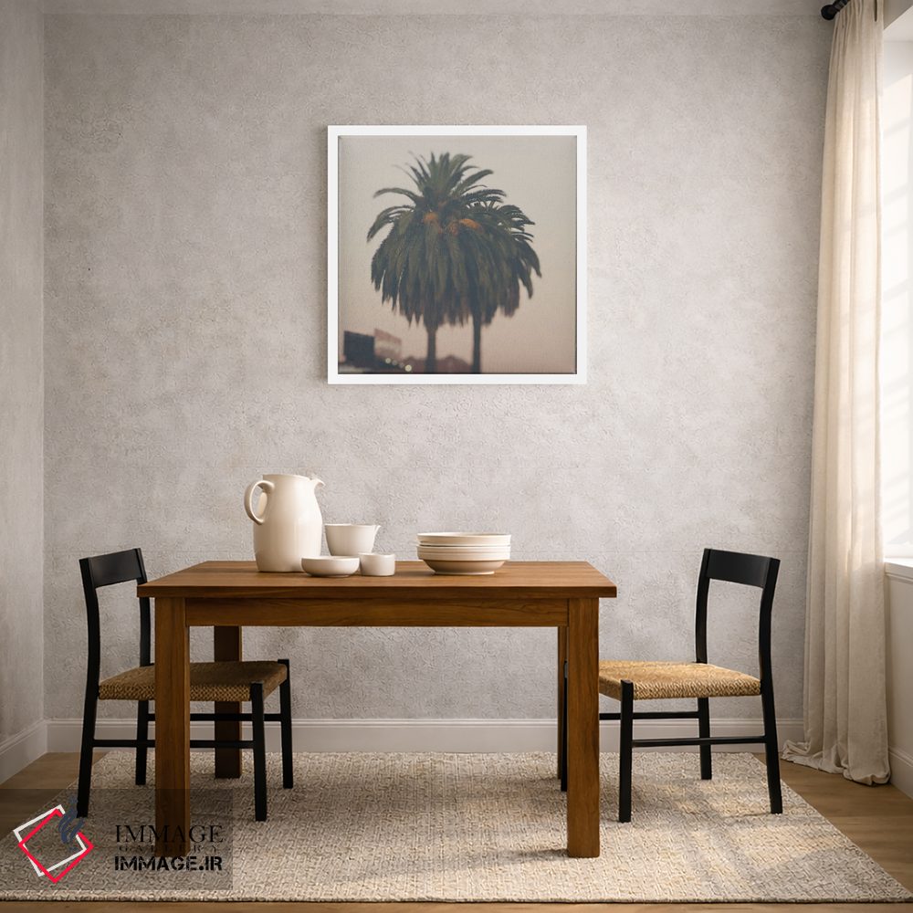 براساس پالت گرم اثر، قاب بلوط روشن (چوبی) پیشنهاد اول است و استخوانی ملایم مکمل. برای سفارشهای پروژهای با ابعاد و قابهای اختصاصی با ایماژ در تماس باشید.