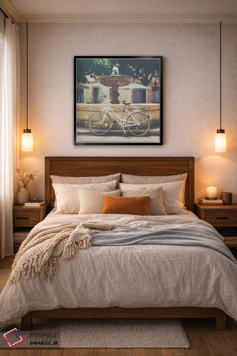براساس پالت گرم اثر، قاب بلوط روشن (چوبی) پیشنهاد اول است و استخوانی ملایم مکمل. برای سفارشهای پروژهای با ابعاد و قابهای اختصاصی با ایماژ در تماس باشید.