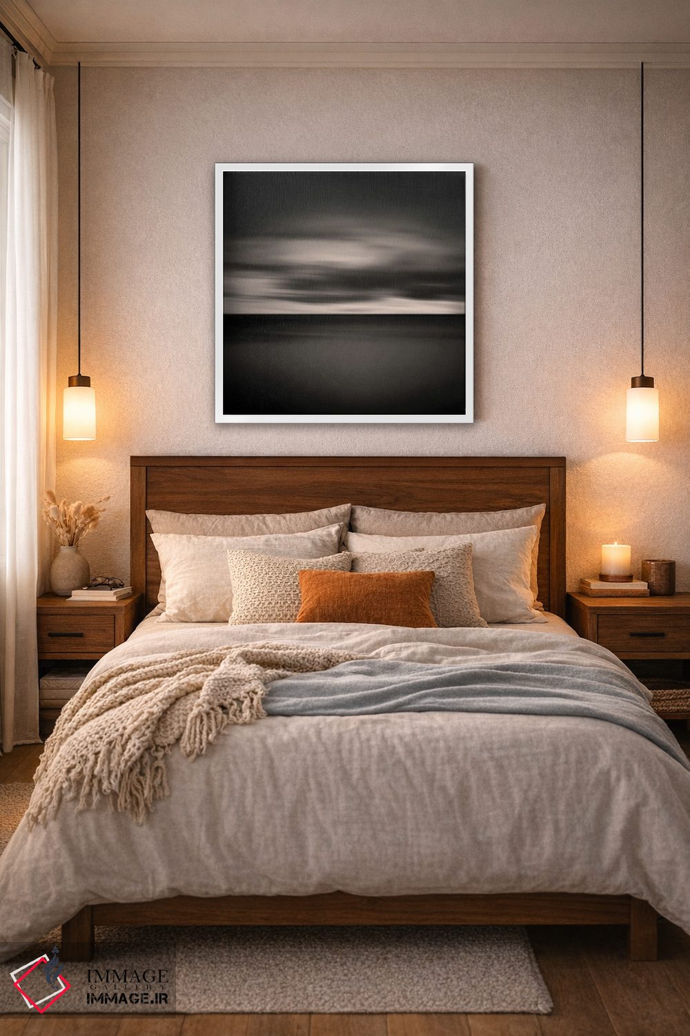 براساس پالت خنثی اثر، قاب بلوط روشن (چوبی) پیشنهاد اول است و استخوانی ملایم مکمل. برای سفارشهای پروژهای با ابعاد و قابهای اختصاصی با ایماژ در تماس باشید.