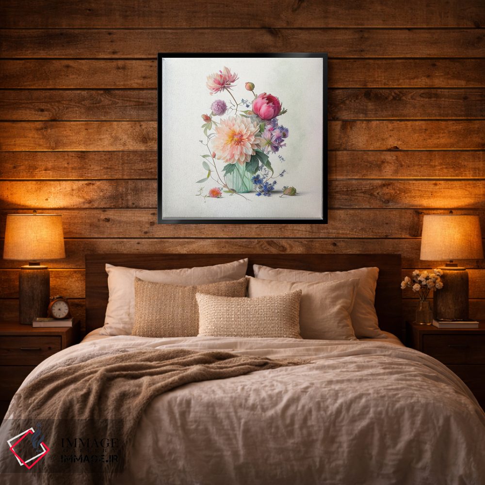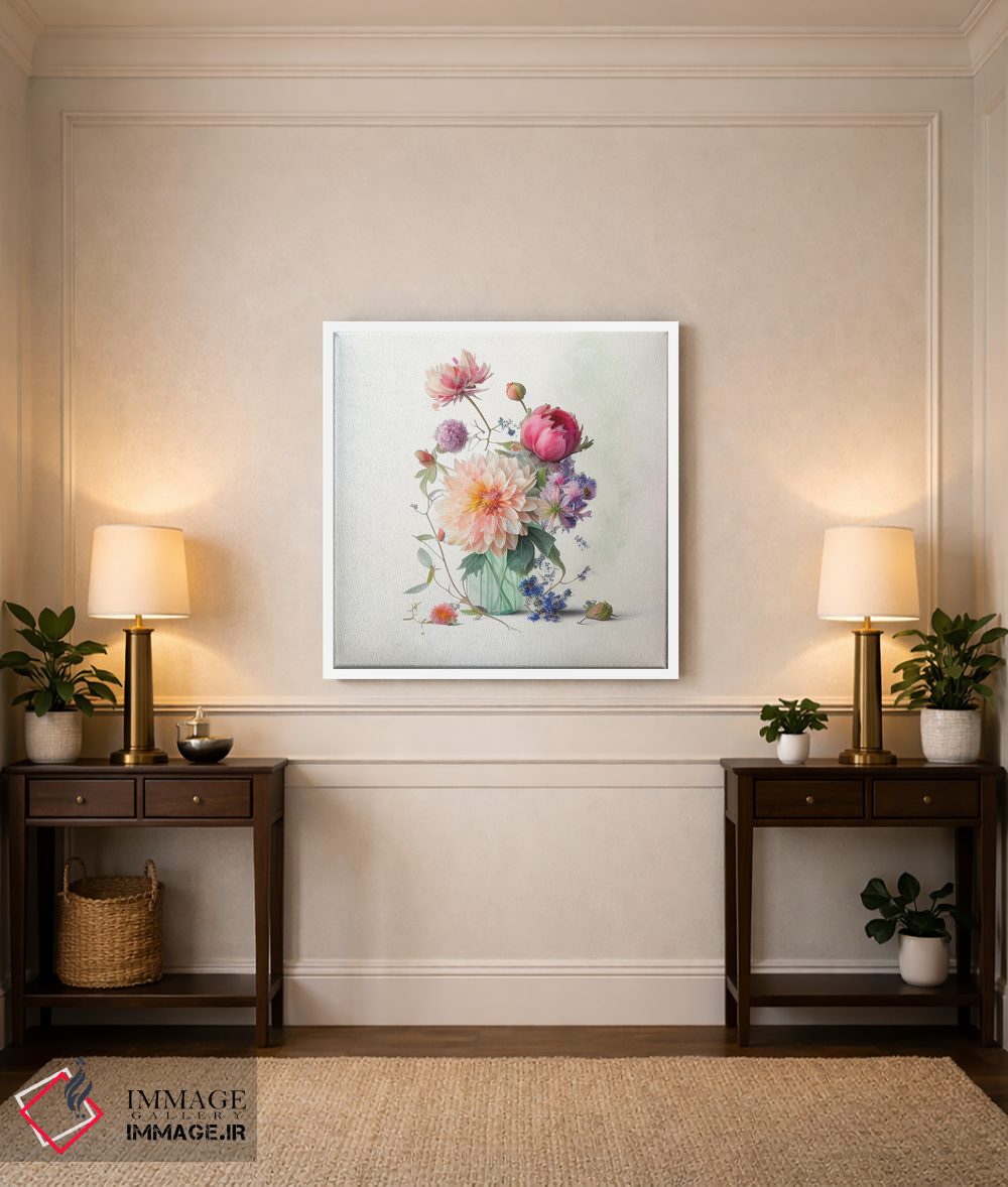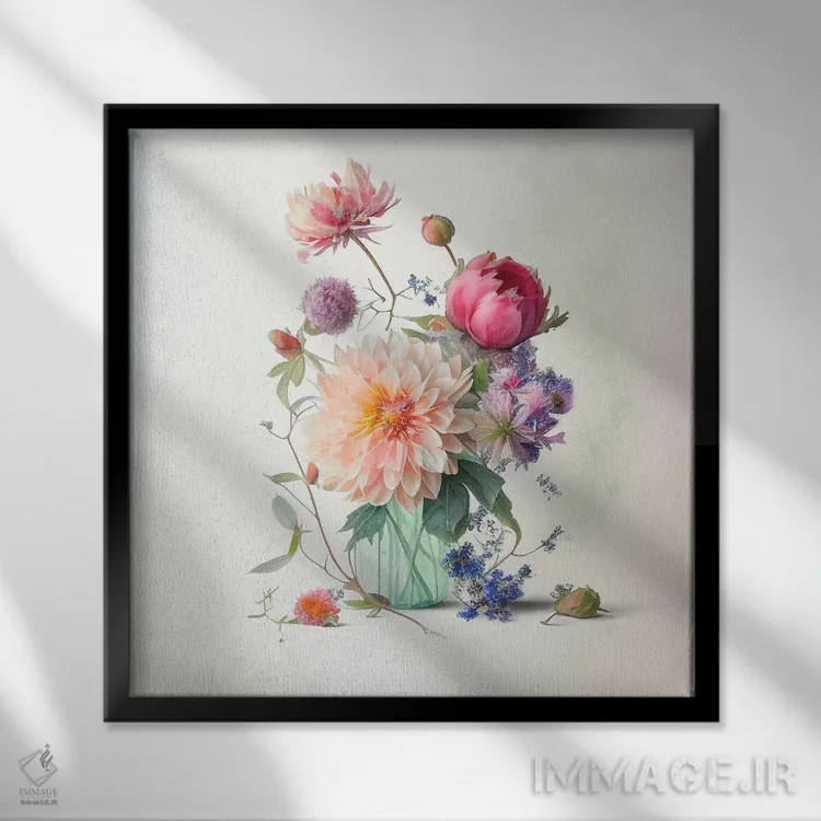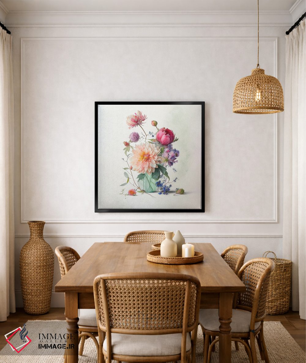 برای دیواری که میخواهید نرمتر دیده شود، «دسته گل داهلیا در شیشه آبی» اثرِ «لیا مکلین» در کنار چوب و پارچههای روشن، عالی مینشیند؛ برای فضای غذاخوری انتخابی خوشسلیقه است. اگر دنبال «زیباییِ بیصدا» هستید، این اثر همان حس را دارد.