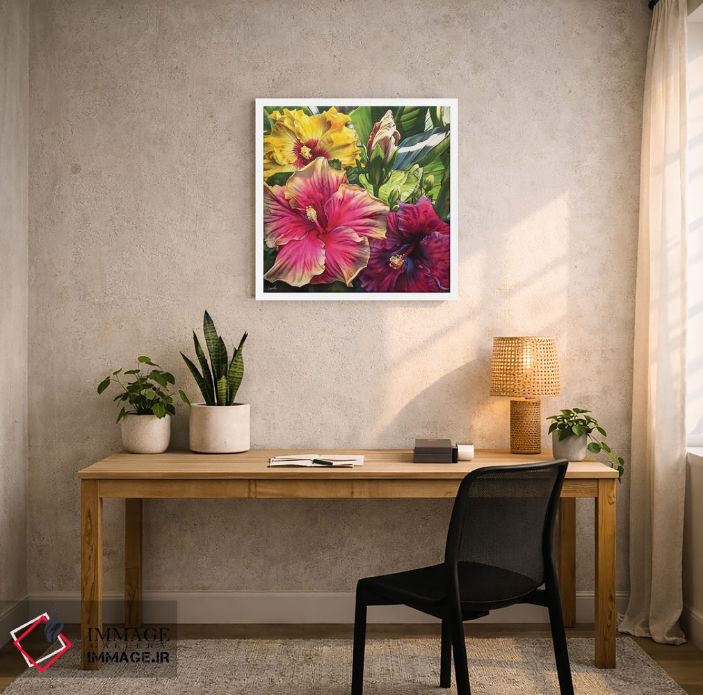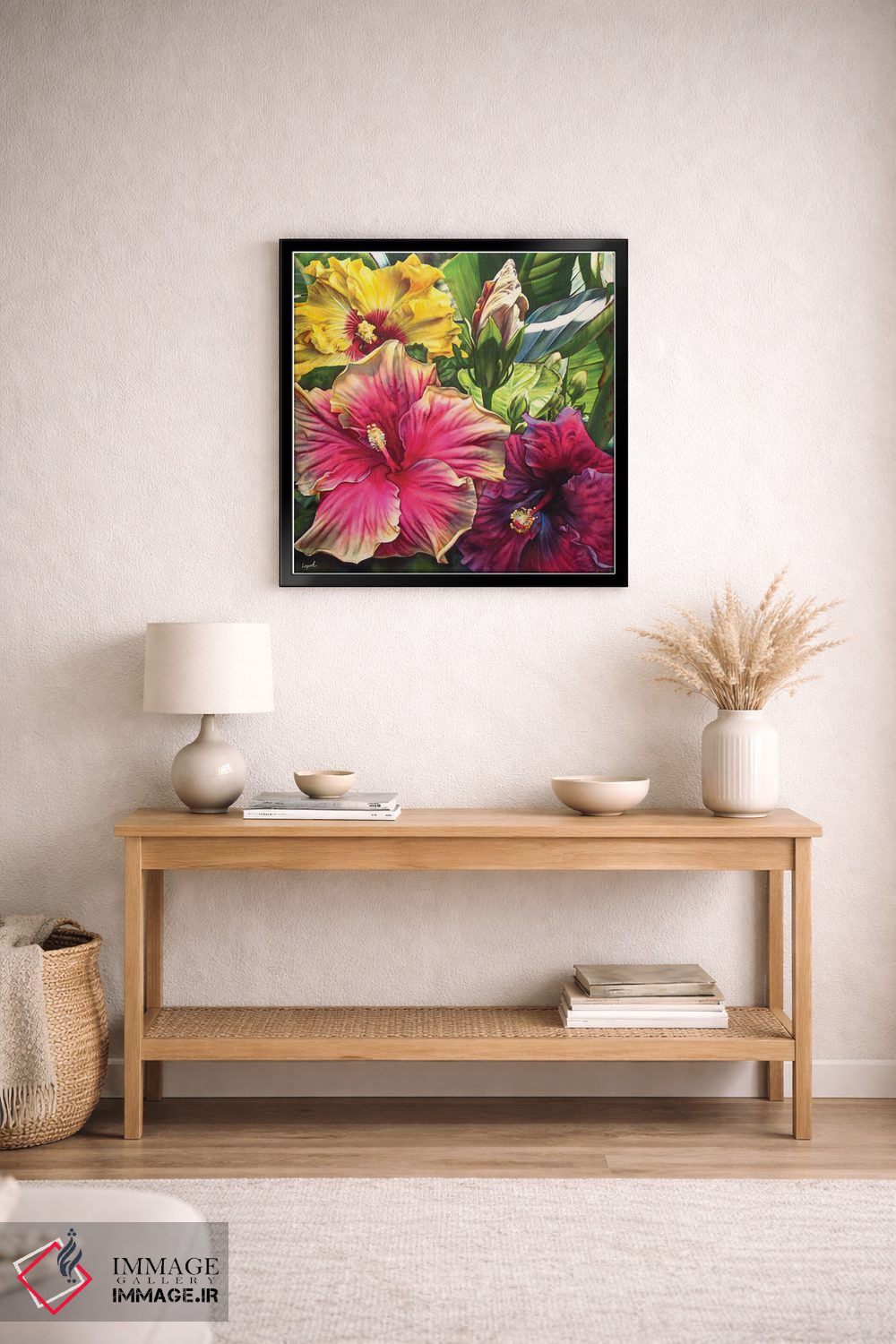 براساس پالت ترکیبی اثر، قاب تیک گرم (چوبی) پیشنهاد اول است و مشکی مات (فریم متوسط) مکمل. برای سفارشهای پروژهای با ابعاد و قابهای اختصاصی با ایماژ در تماس باشید.