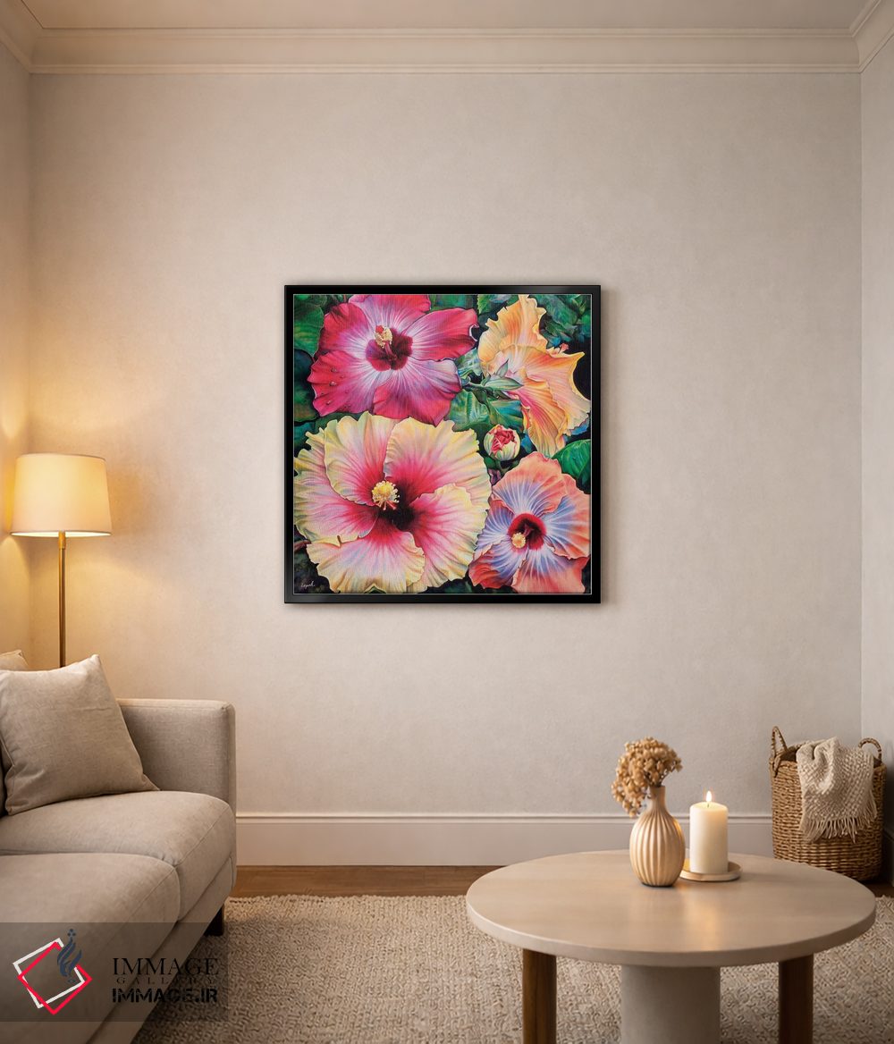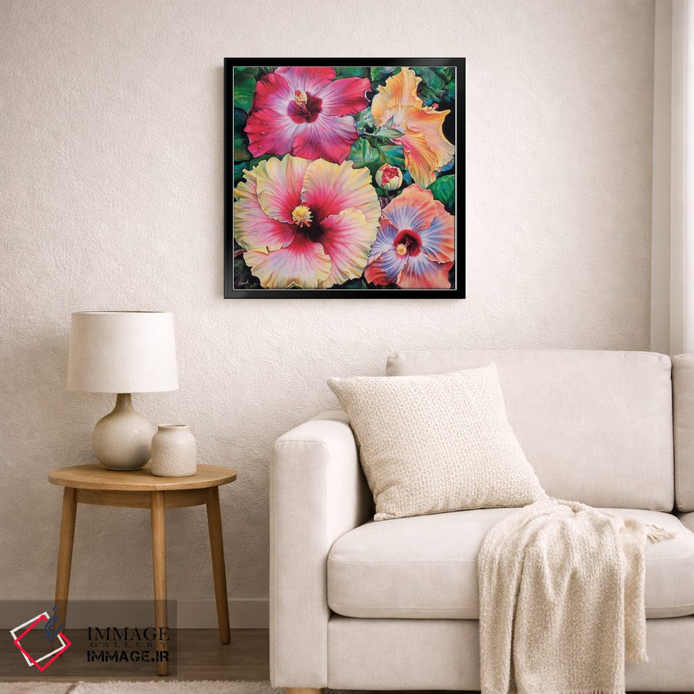 براساس پالت ترکیبی اثر، قاب تیک گرم (چوبی) پیشنهاد اول است و مشکی مات (فریم متوسط) مکمل. برای سفارشهای پروژهای با ابعاد و قابهای اختصاصی با ایماژ در تماس باشید.