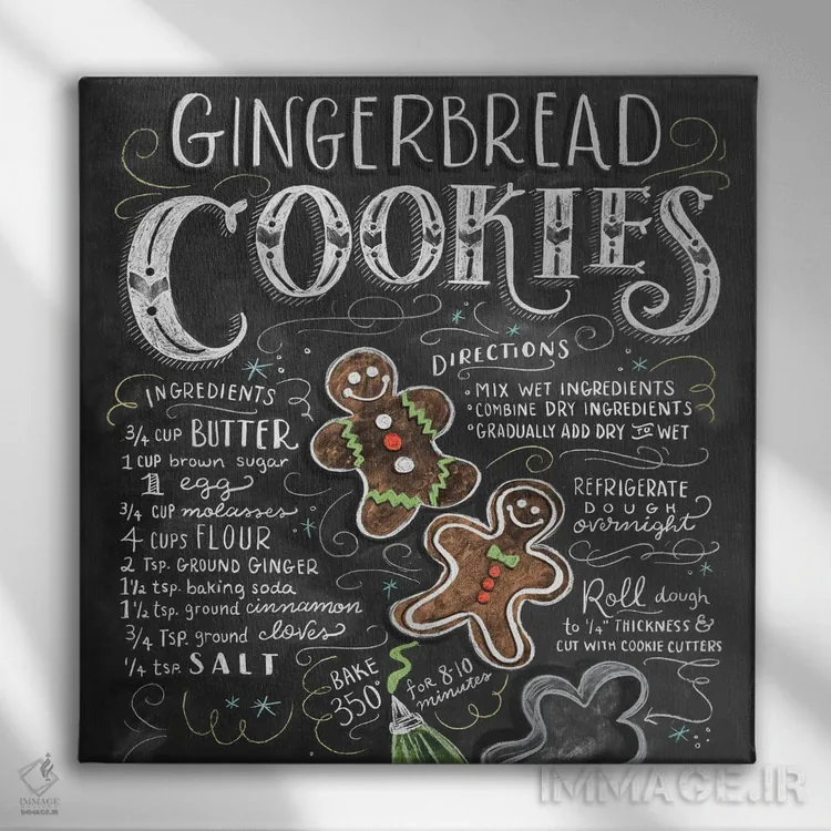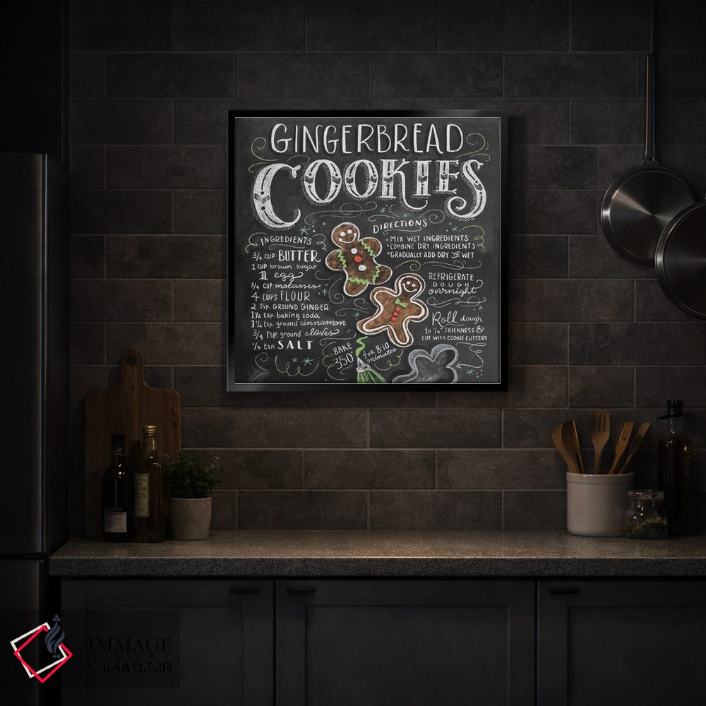 این تابلو با عنوان «دستور تهیه کلوچه زنجبیلی» اثرِ «لیلی و ول (برند کارت و هنر)»، حسِ گرم و صمیمی به فضا میدهد.