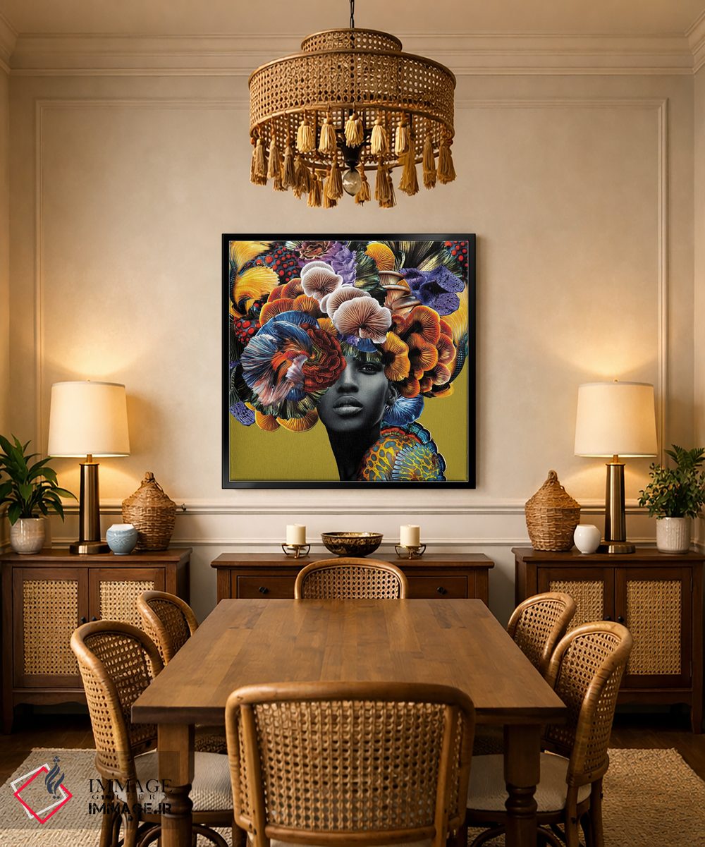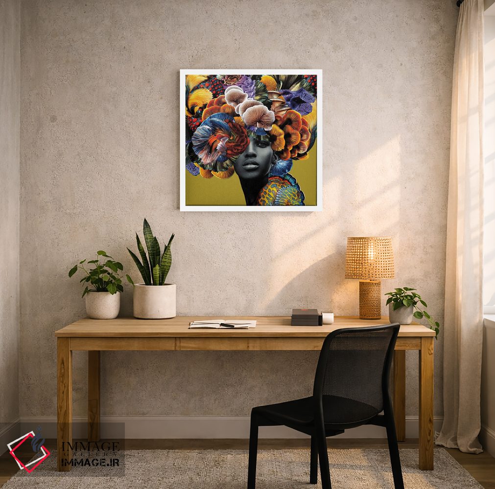 براساس پالت ترکیبی اثر، قاب تیک گرم (چوبی) پیشنهاد اول است و مشکی مات (فریم متوسط) مکمل. برای سفارشهای پروژهای با ابعاد و قابهای اختصاصی با ایماژ در تماس باشید.