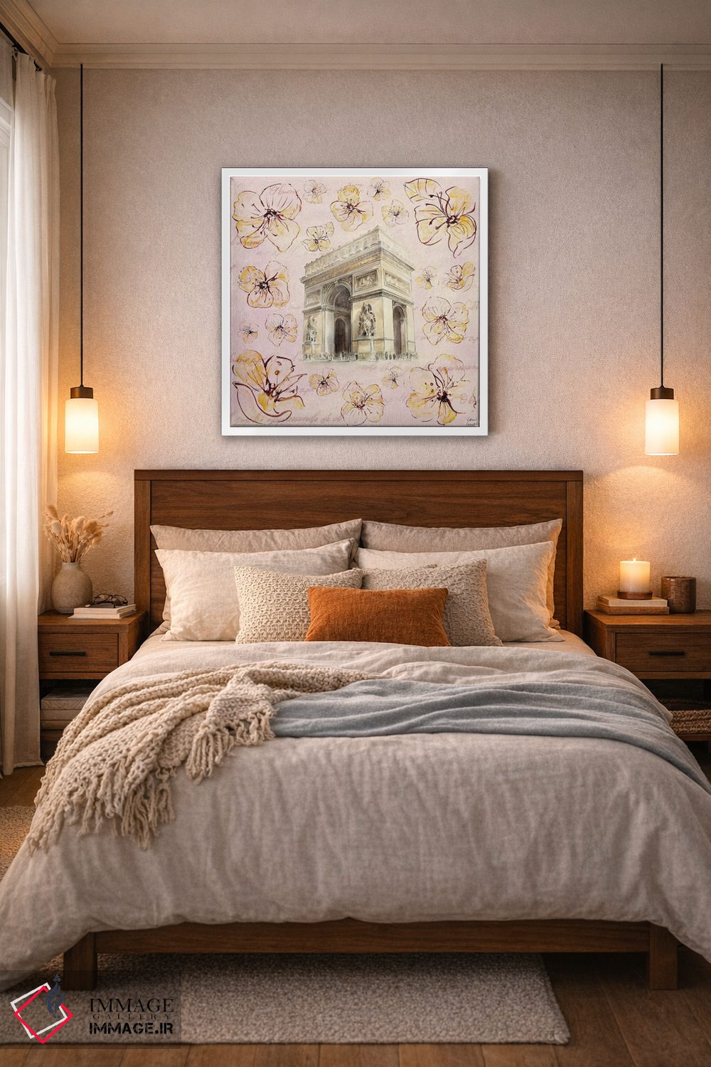 براساس پالت گرم اثر، قاب بلوط روشن (چوبی) پیشنهاد اول است و استخوانی ملایم مکمل. برای سفارشهای پروژهای با ابعاد و قابهای اختصاصی با ایماژ در تماس باشید.