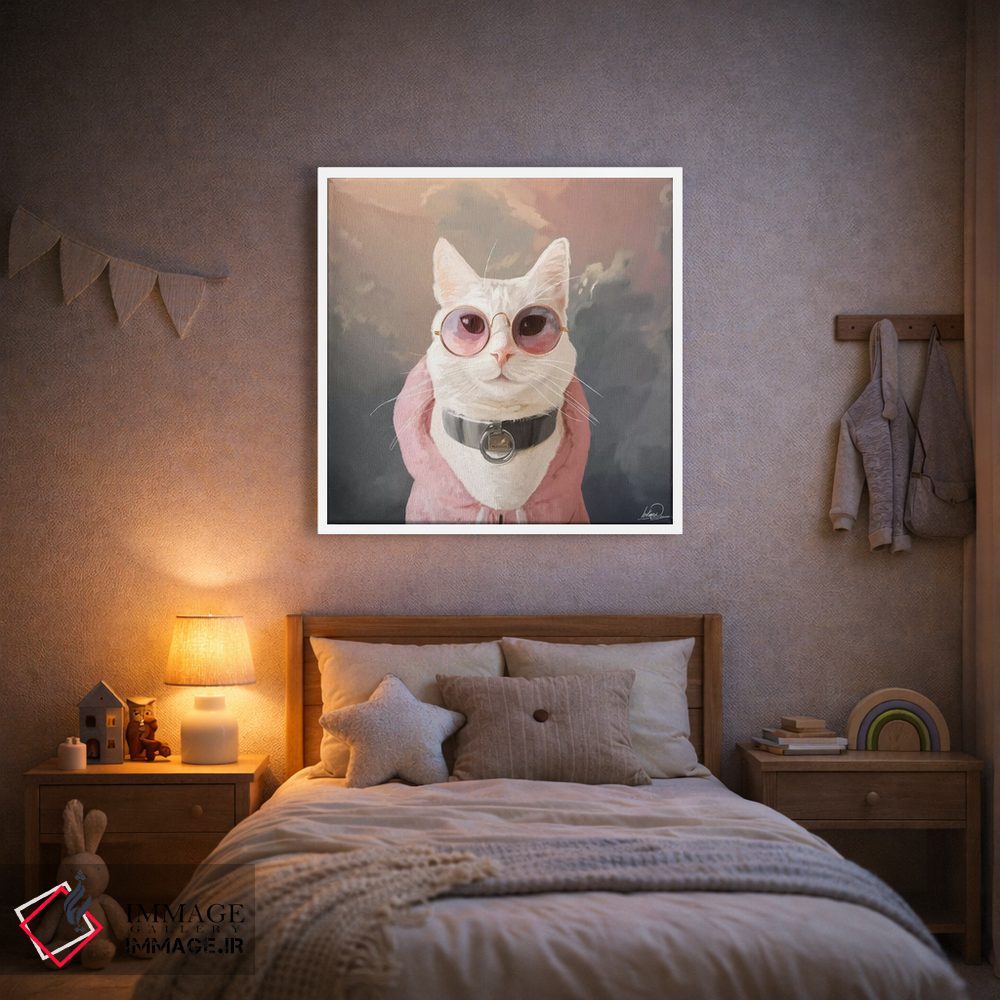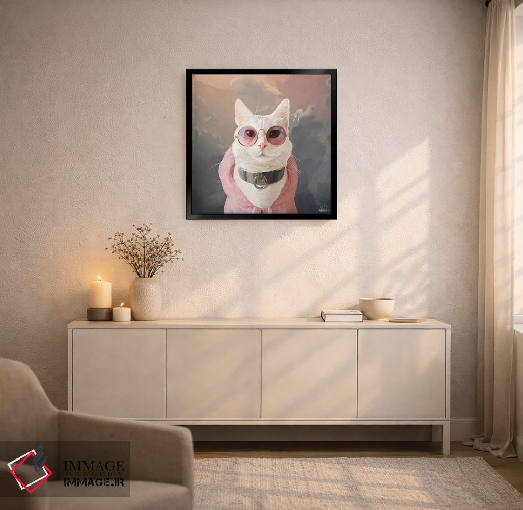 «پرتره گربه مد روز» اثرِ «لاستاناو» میتواند فضا را صمیمیتر و دعوتکنندهتر نشان بدهد؛ برای خانههایی با چوب و پارچههای گرم پیشنهاد میشود. با قاب چوبی یا مشکی، حس مرتبتری پیدا میکند.