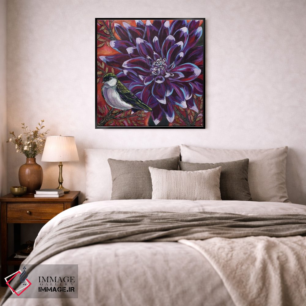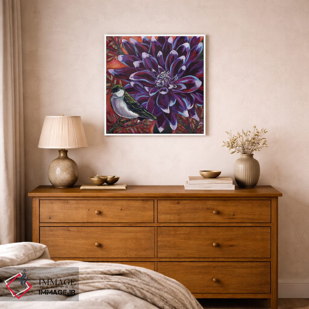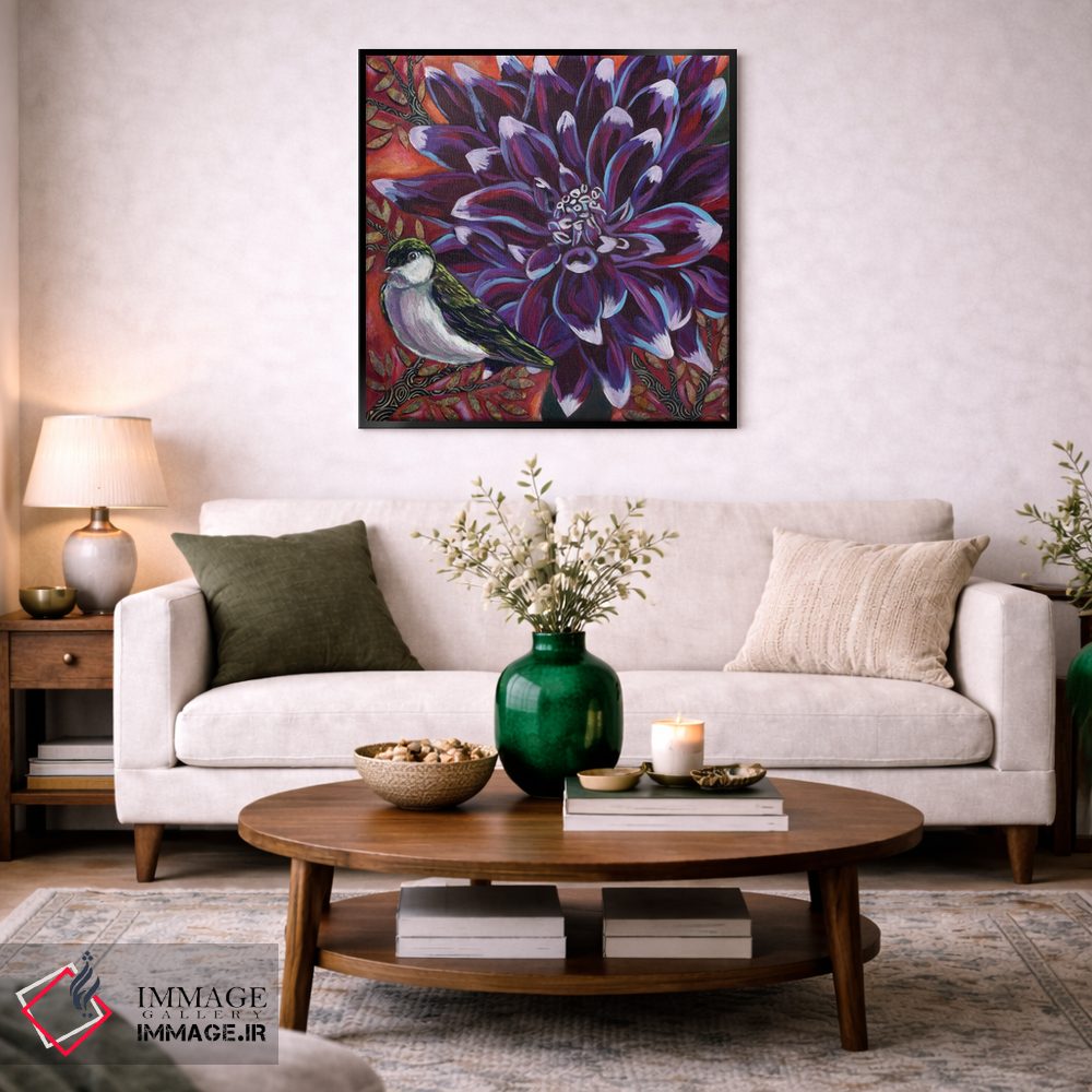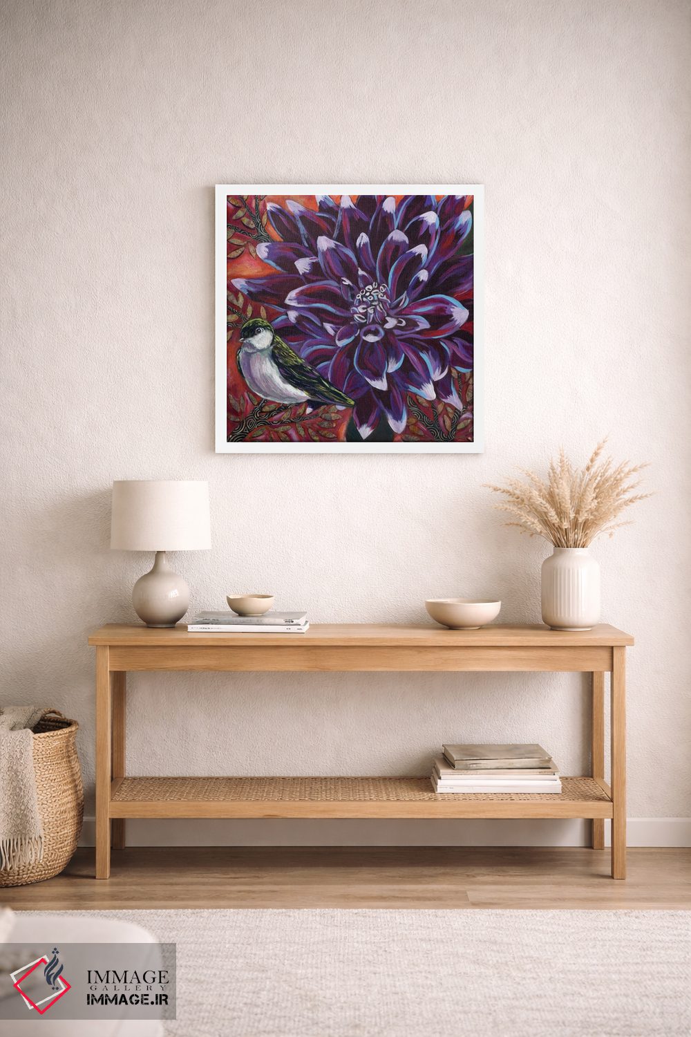 اگر میخواهید دیوار کمی سرزندگیِ محترمانه داشته باشد، «سبز بنفش I» اثرِ «لینهآ توبیاس» به دیوار، انرژیِ نرم و زنده میدهد، برای دکورهایی با رنگهای خنثی گزینهٔ مناسبیست. با نورپردازی نقطهای، جذابتر هم میشود.