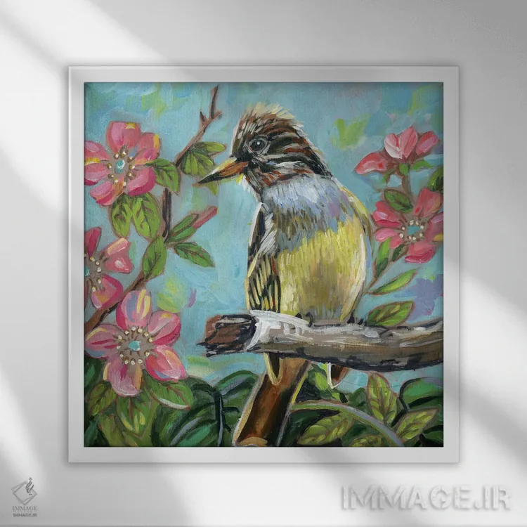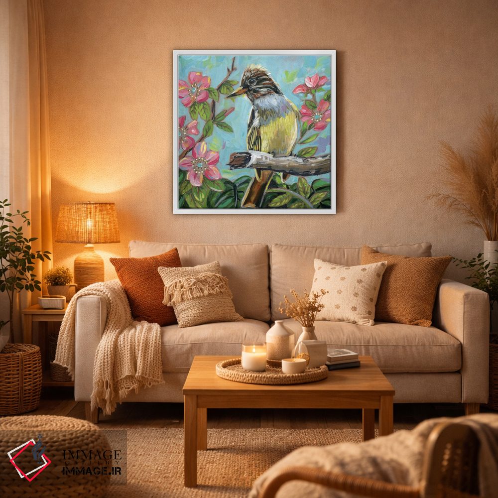 اگر دوست دارید دیوار روشنتر و آرامتر دیده شود، «مگسگیر تاجدار بزرگ (گونه پرنده)» اثرِ «لینهآ توبیاس» تعادل رنگیِ لطیفی به چیدمان میدهد، برای خانههایی با نور طبیعی گزینهٔ مناسبیست. جزئیاتش از نزدیک هم ارزش تماشا دارد.