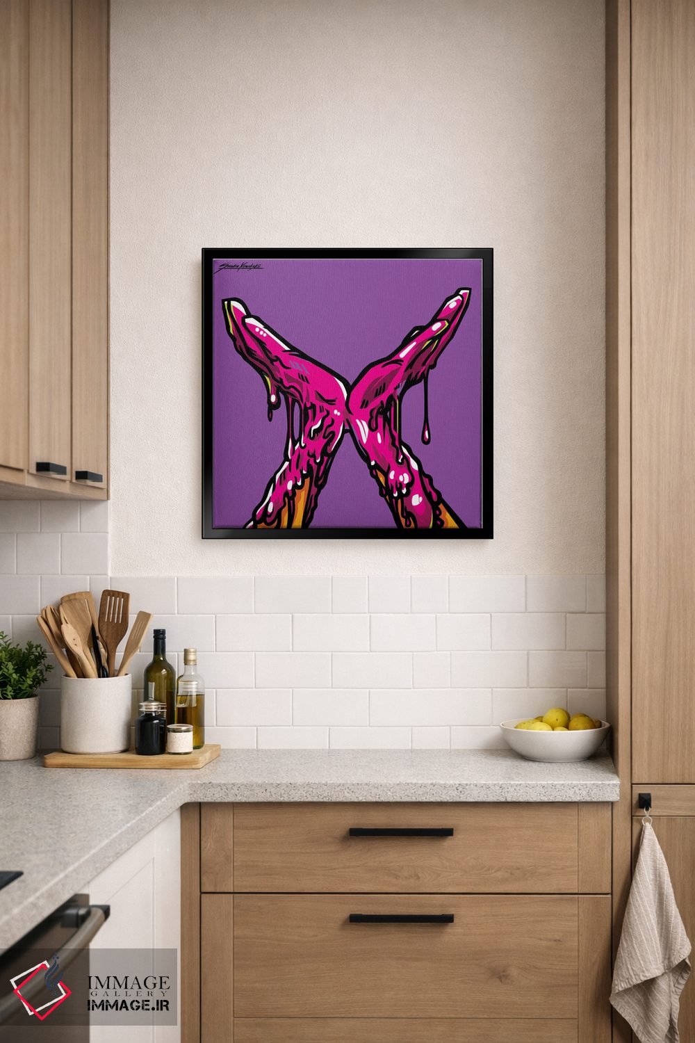 براساس پالت ترکیبی اثر، قاب تیک گرم (چوبی) پیشنهاد اول است و مشکی مات (فریم متوسط) مکمل. برای سفارشهای پروژهای با ابعاد و قابهای اختصاصی با ایماژ در تماس باشید.