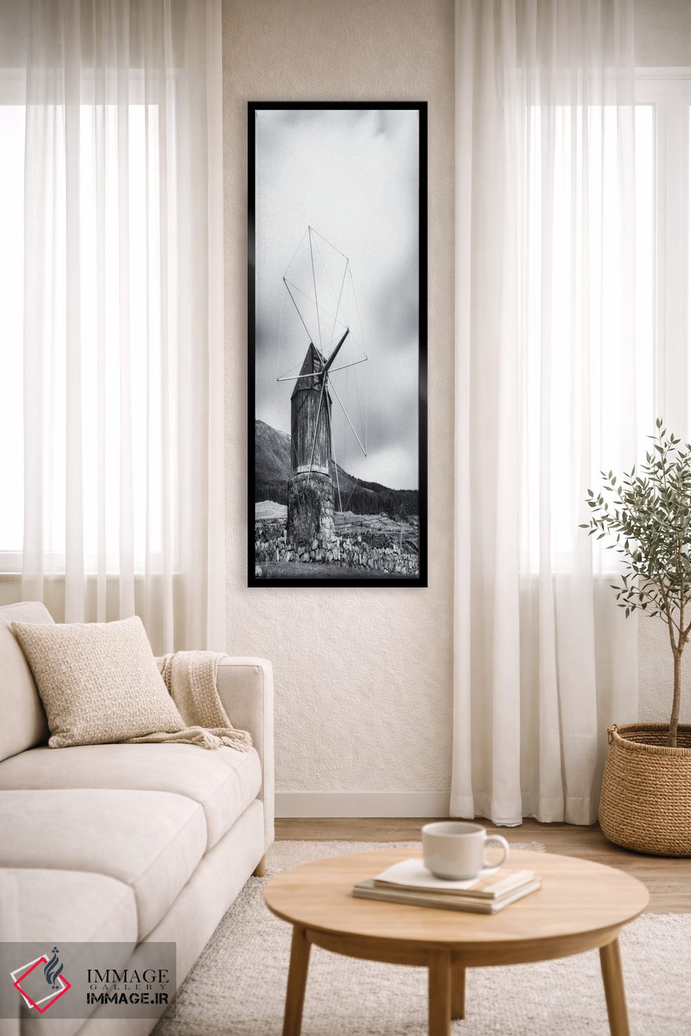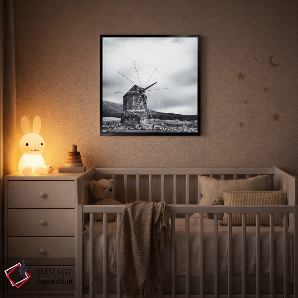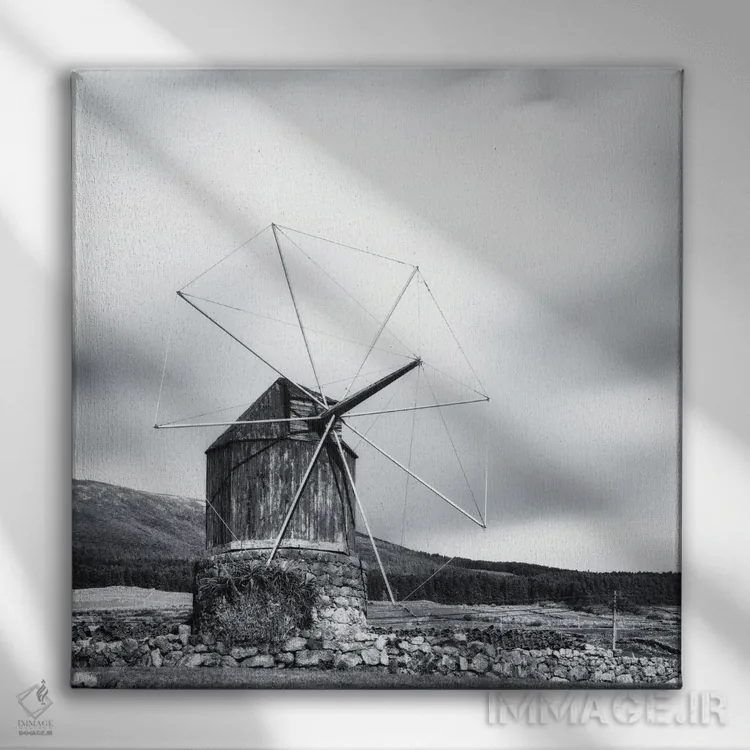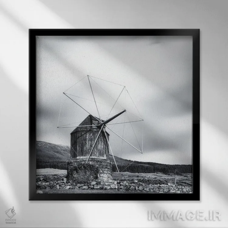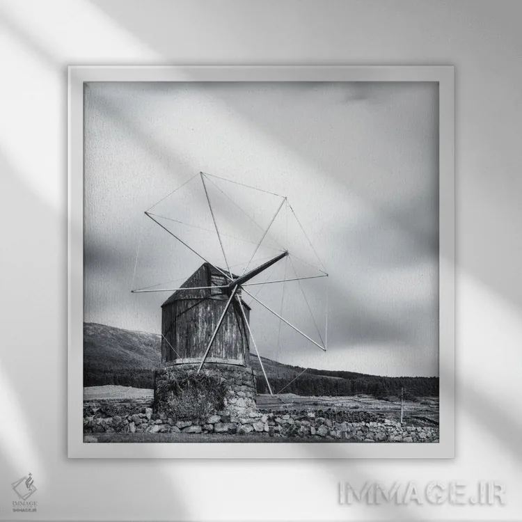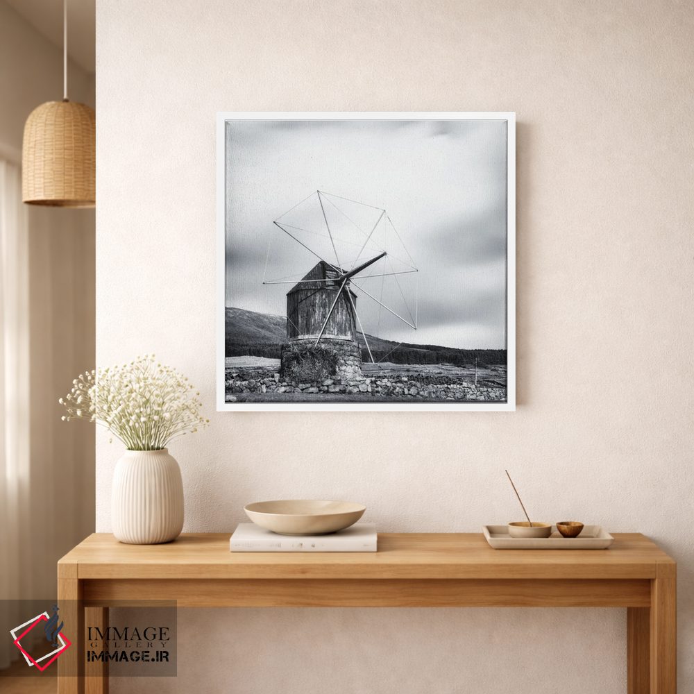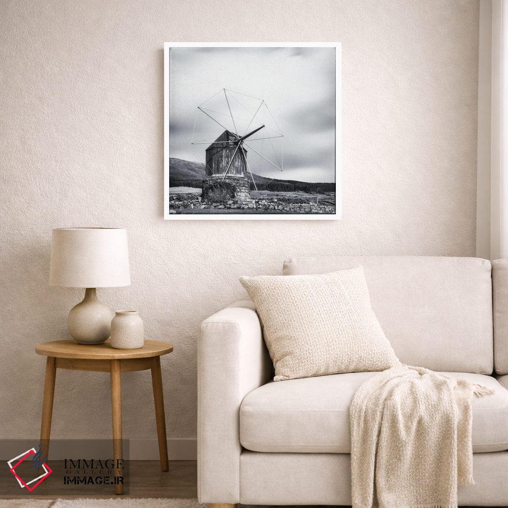 «آسیاب بادی چوبی قدیمی» اثرِ «کریم کارلا» در فضای عکاسی سیاهوسفید، روی نور و کنتراست تکیه میکند؛ موضوعِ این اثر برای دکورهای مینیمال عالی است.