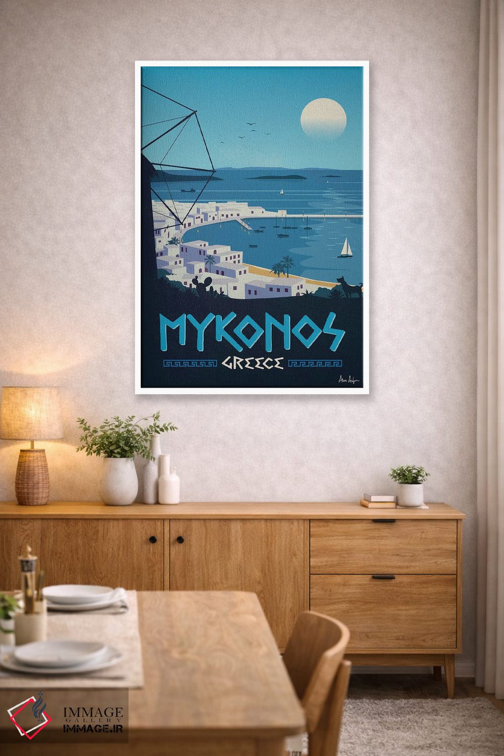 اگر دنبال یک تابلو با انرژی کنترلشده هستی، «پوستر میکونوس» اثرِ «ایدیااستورم استودیوز (استودیو هنری)» با تم این اثر و اجرای هنری گزینهی قابل اتکاست.