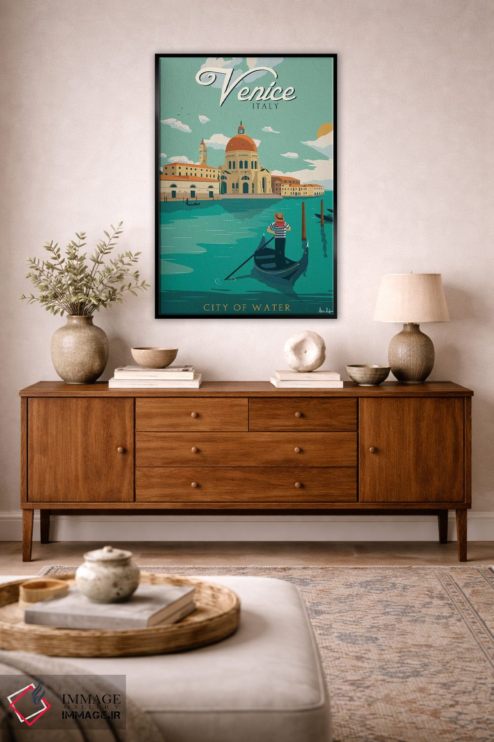 برای ترکیب با گلدانهای سبز، پارچههای ساده و نور گرم، «ونیز» اثرِ «ایدیااستورم استودیوز (استودیو هنری)» با موضوعِ این اثر انتخابی هماهنگ است.