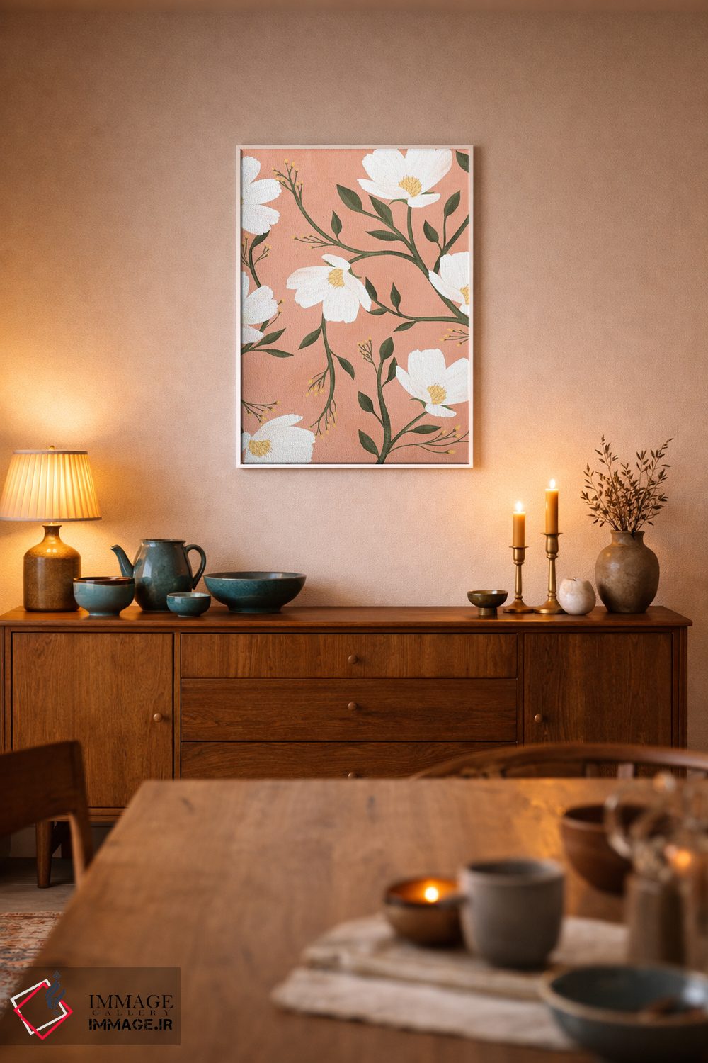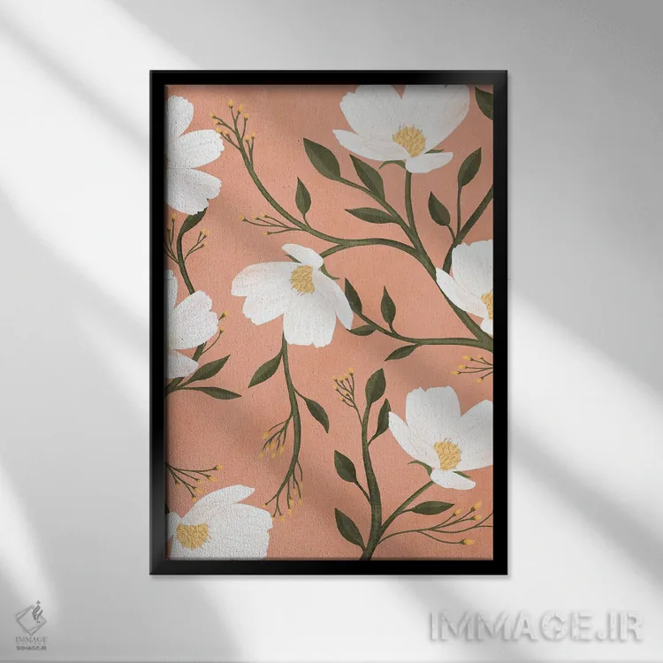 برای دیواری که میخواهید نرمتر دیده شود، «گلها (اسپانیایی)» اثرِ «ایتسفانیهو (هنرمند دیجیتال)» چیدمان را از خشکی بیرون میآورد؛ برای فضای غذاخوری انتخابی خوشسلیقه است. جزئیاتش از نزدیک هم ارزش تماشا دارد.