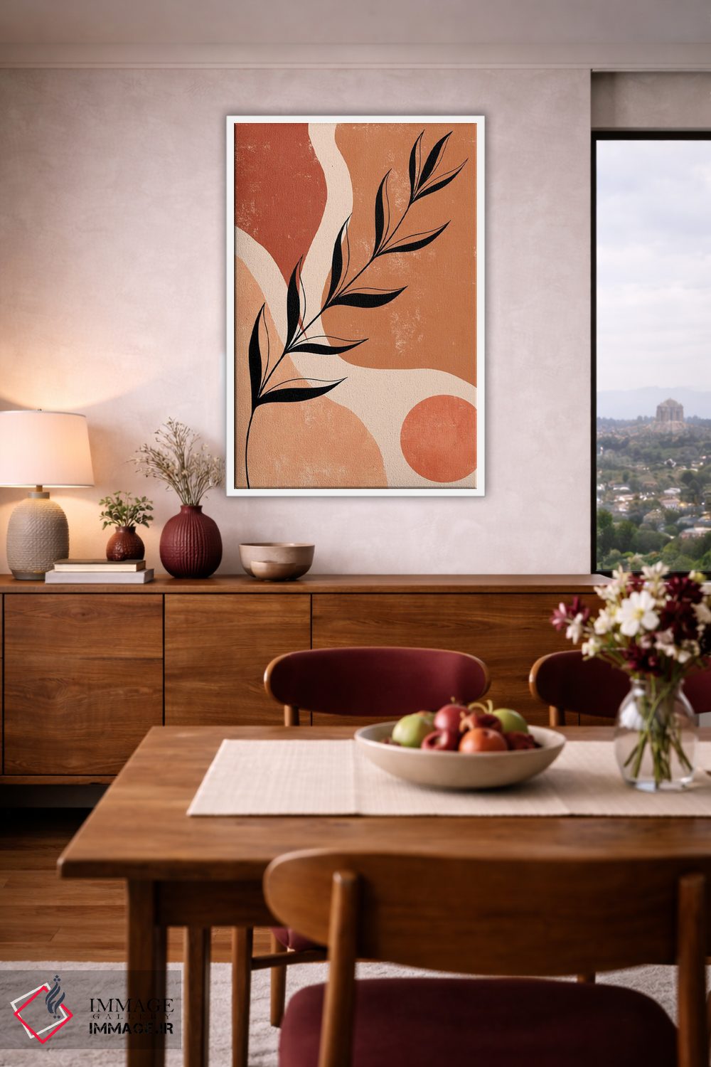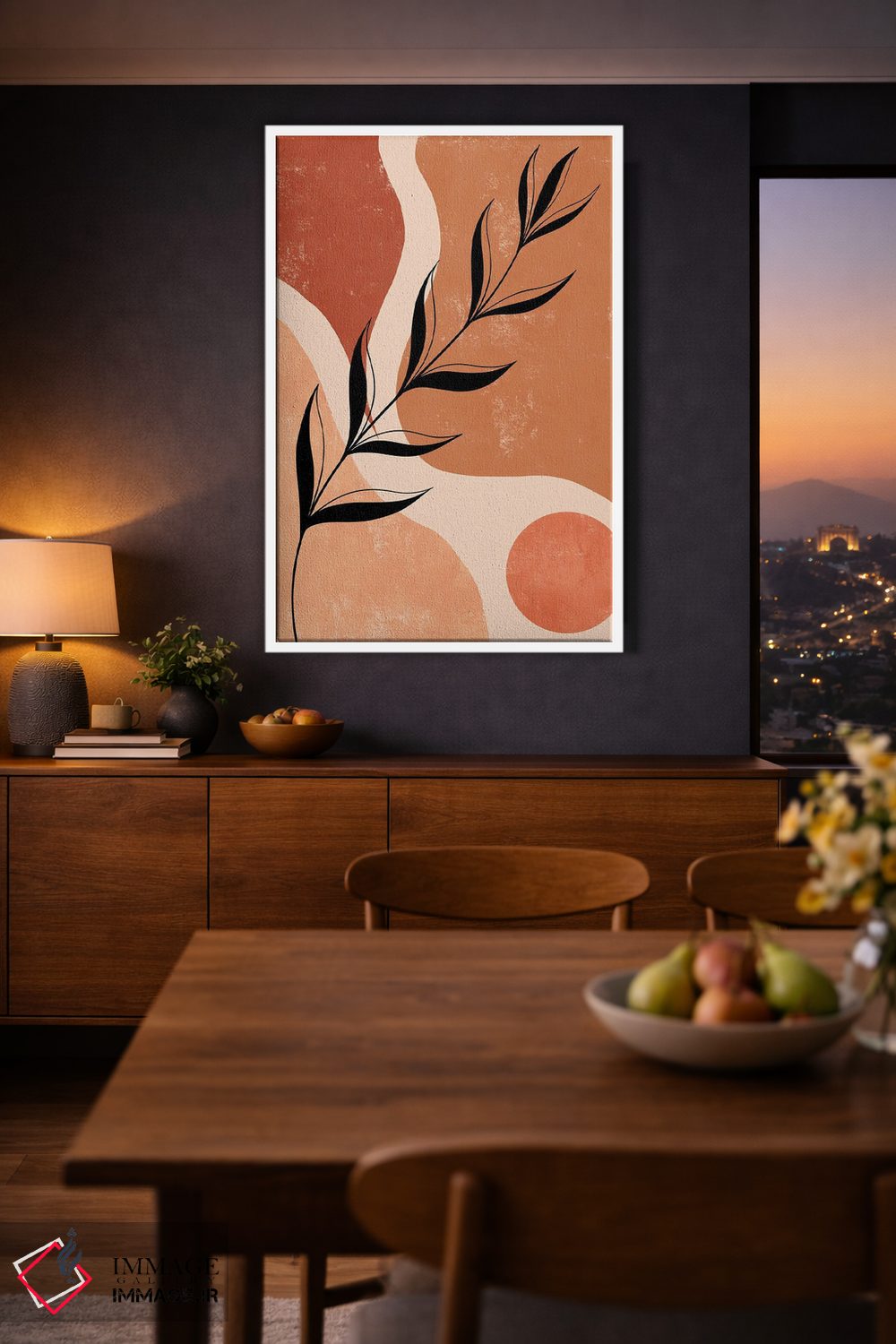 براساس پالت گرم اثر، قاب تیک گرم (چوبی) پیشنهاد اول است و مشکی مات (فریم متوسط) مکمل. برای سفارشهای پروژهای با ابعاد و قابهای اختصاصی با ایماژ در تماس باشید.