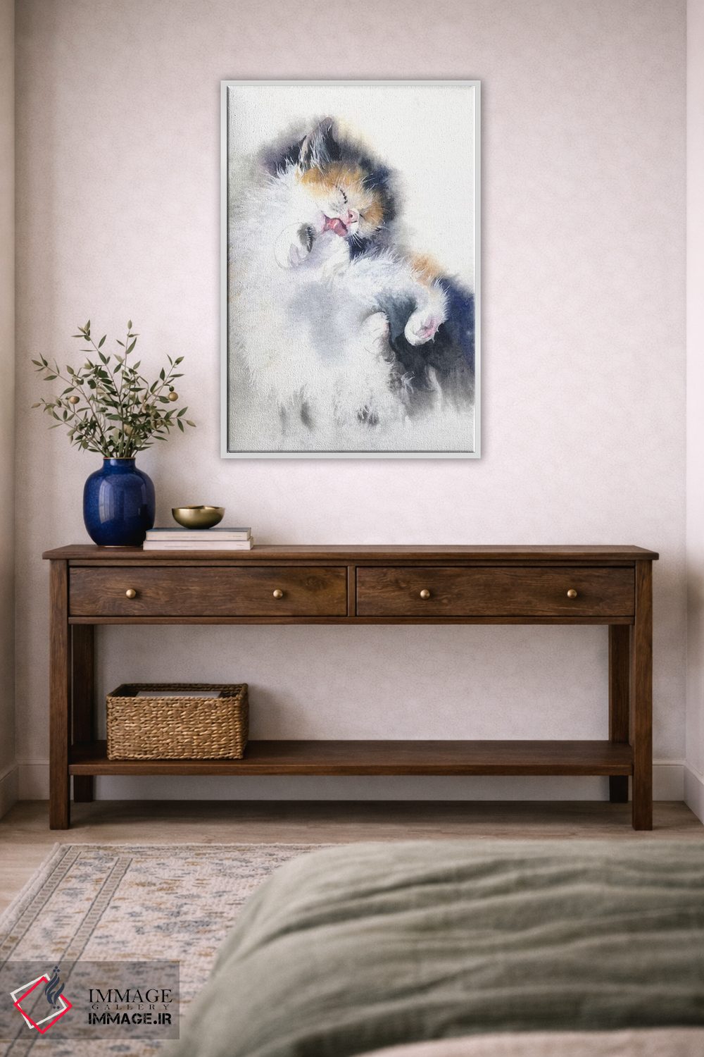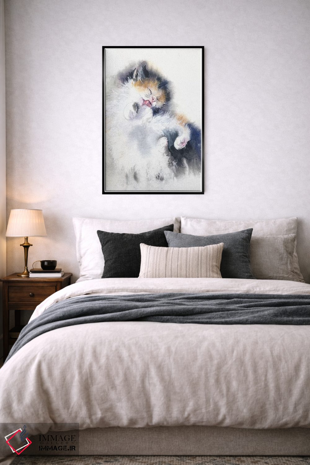 «حمام بچهگربه» اثرِ «مارینا ایگناتووا» میتواند به دیوار، انرژیِ نرم و زنده بدهد؛ برای دکورهای مدرن و مینیمال پیشنهاد میشود. با قاب چوبی یا مشکی، حس مرتبتری پیدا میکند.
