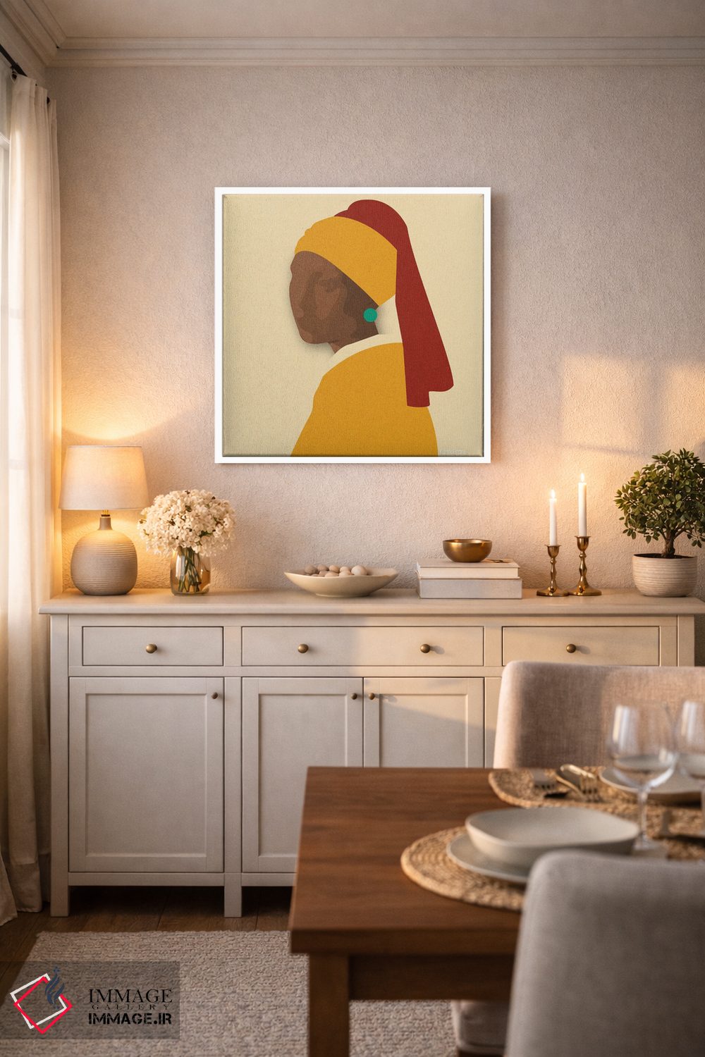 «دختر با گوشواره فیروزهای» اثرِ «کمو فرانک» میتواند به فضا حسِ مجلهای و ترندی بدهد.