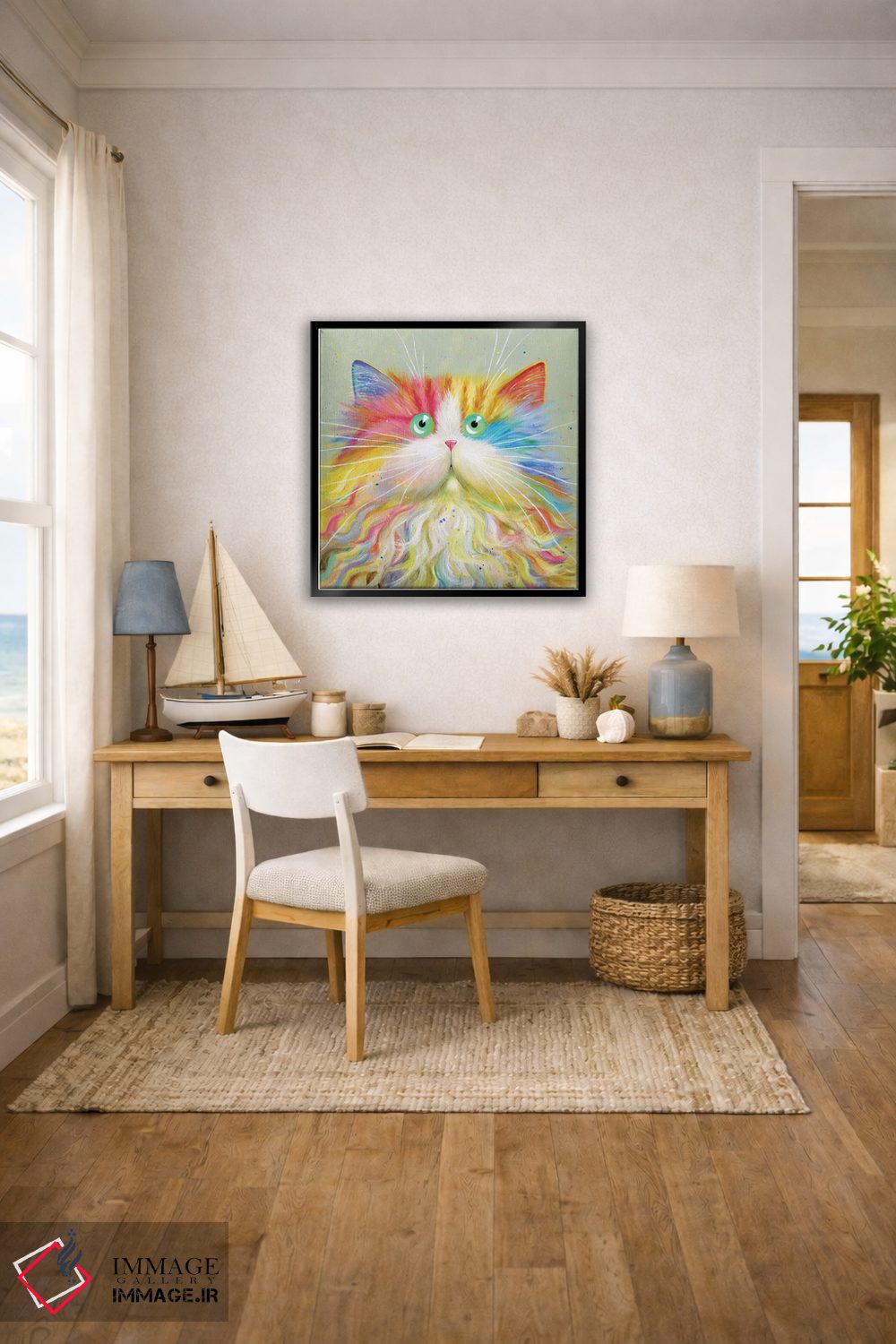 اگر به آثار حیوانات علاقه دارید، «موستاشو» اثرِ «کیم هاسکینز» به فضا، گرمیِ ملایم اضافه میکند، برای دیوار کنار میز کار گزینهٔ مناسبیست. با نورپردازی نقطهای، جذابتر هم میشود.