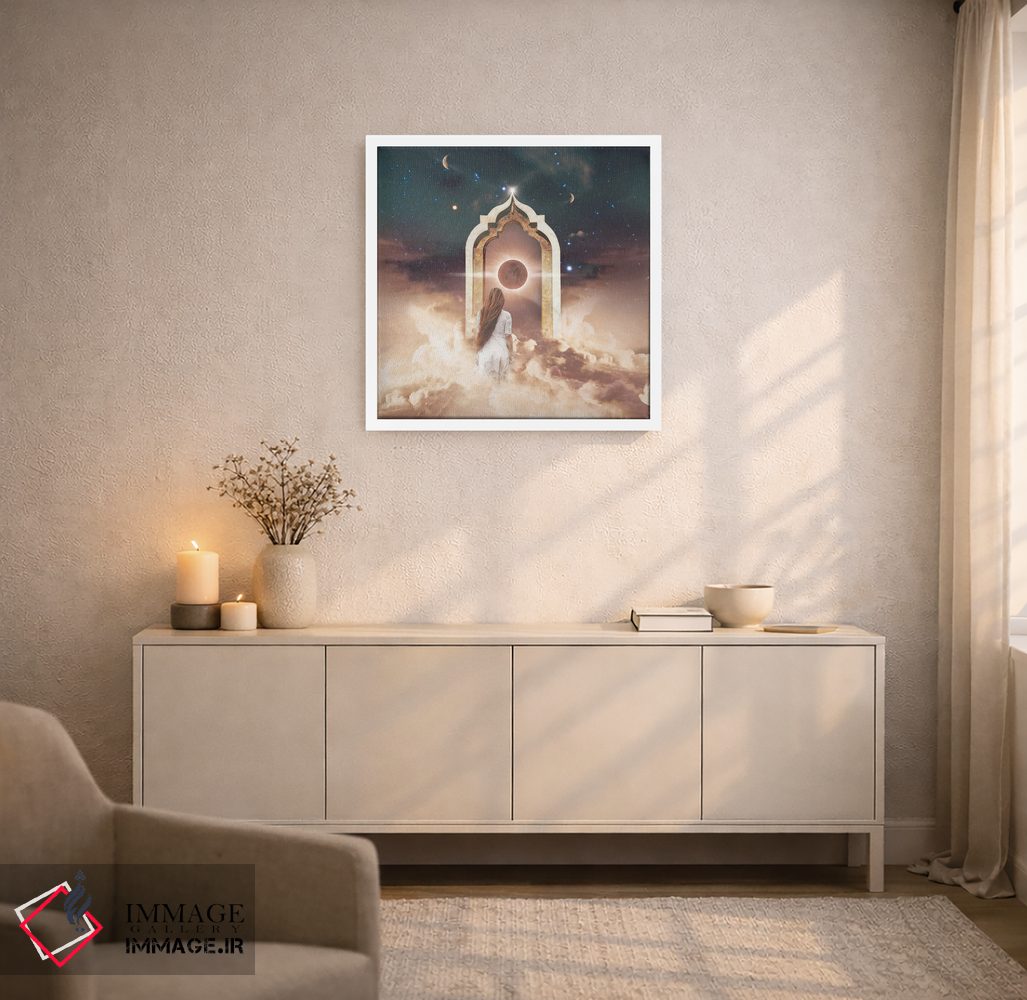 براساس پالت گرم اثر، قاب بلوط روشن (چوبی) پیشنهاد اول است و استخوانی ملایم مکمل. برای سفارشهای پروژهای با ابعاد و قابهای اختصاصی با ایماژ در تماس باشید.