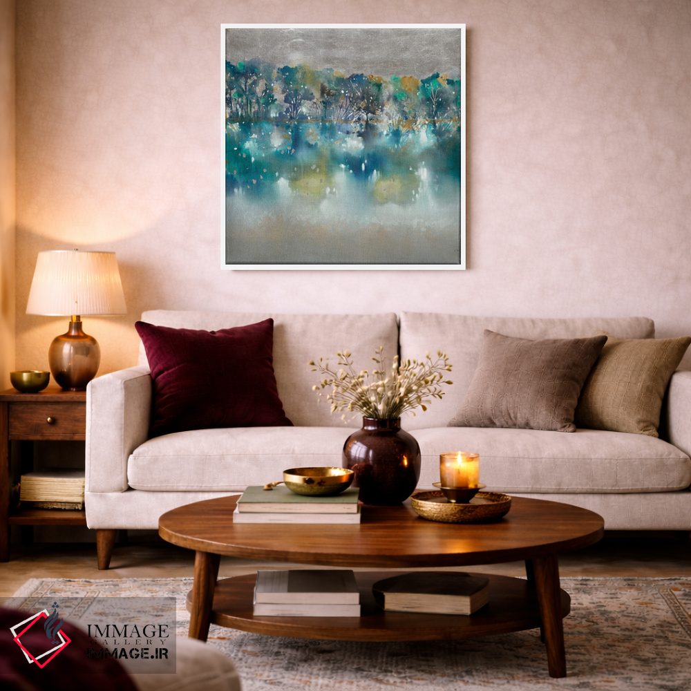اگر دوست دارید دیوار روشنتر و آرامتر دیده شود، «کنار دریاچه» اثرِ «کِی. ناری» برای دیوارهای ساده، یک لطافتِ دقیق میسازد، برای فضای غذاخوری گزینهٔ مناسبیست. برای دیوار گالری هم ترکیبپذیر و خوشنشین است.