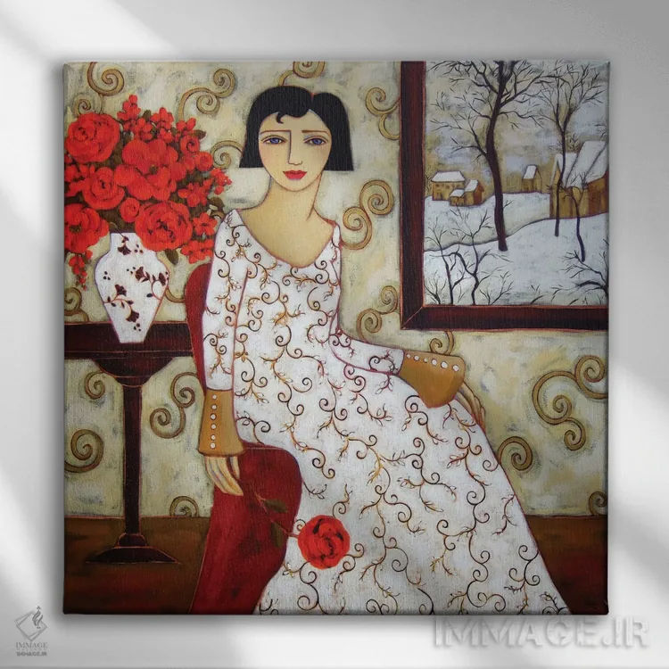 تابلو دکوراتیو زن با منظره زمستانی و گل رز اثر کارن ریگر