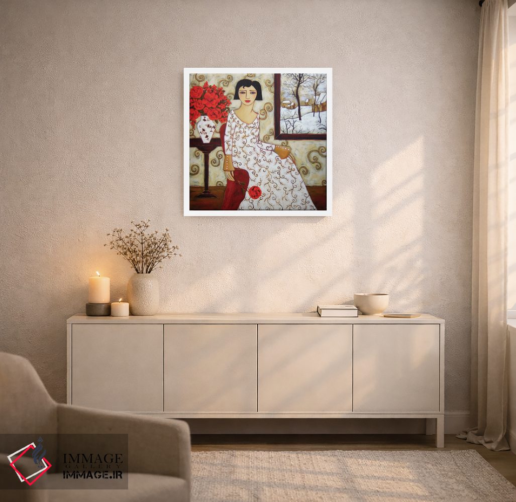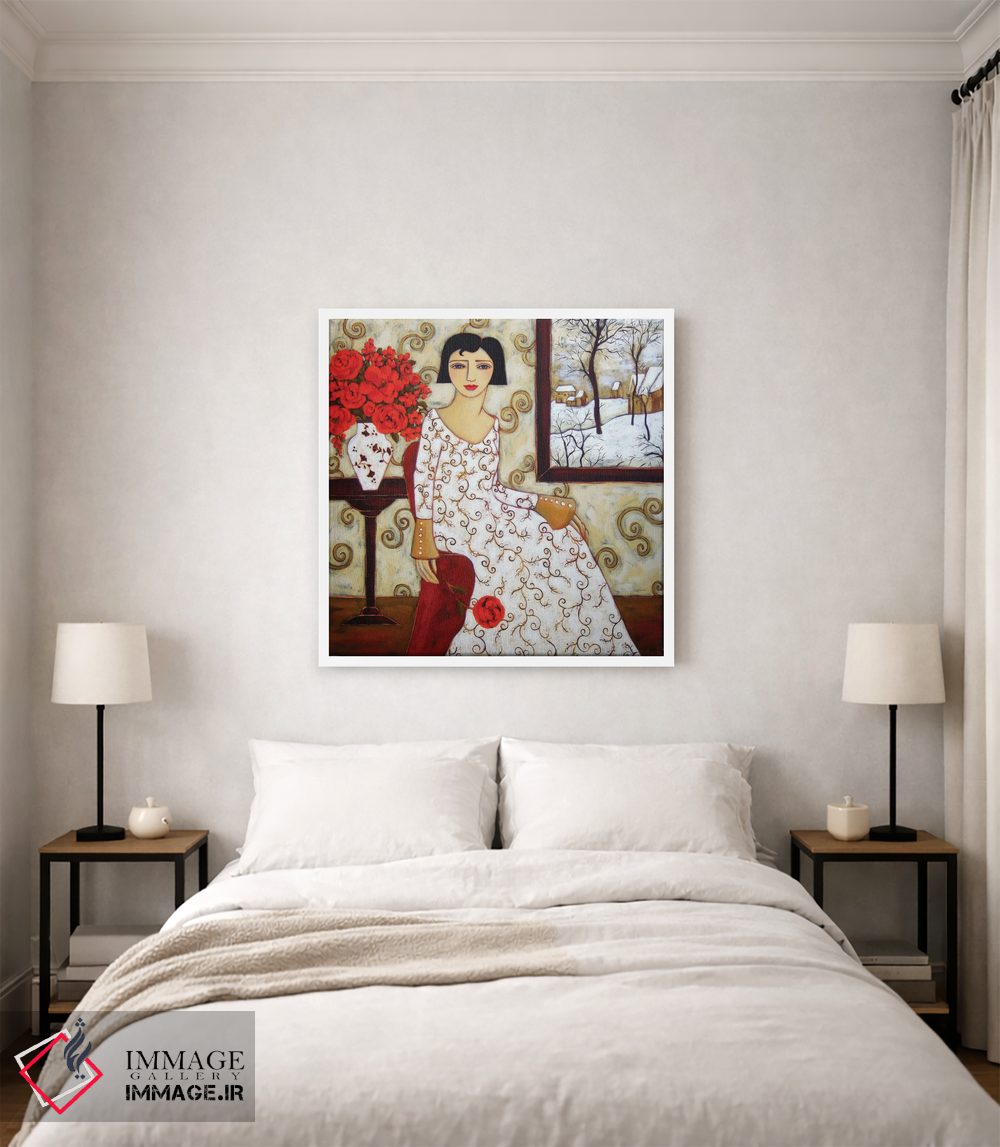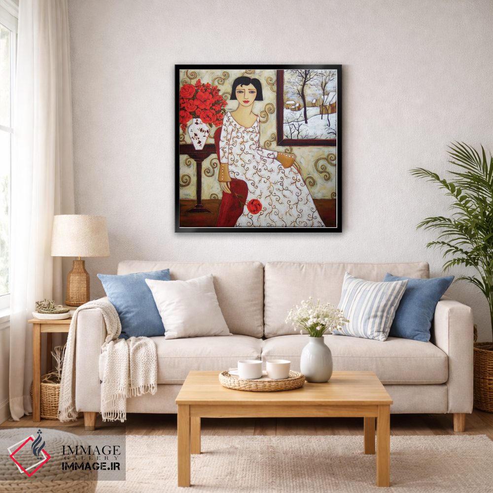 تابلو دکوراتیو زن با منظره زمستانی و گل رز اثر کارن ریگر - نمای روبه‌رو روی دیوار