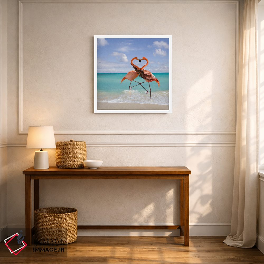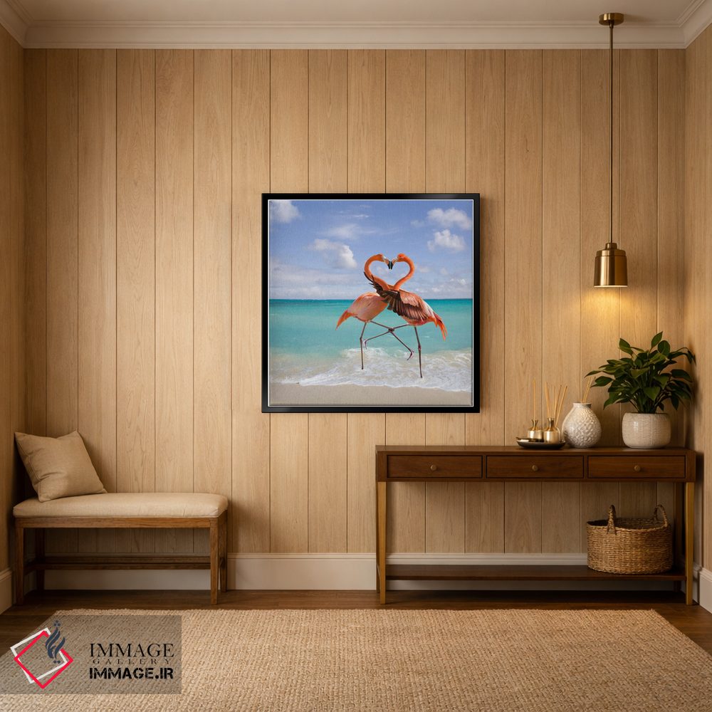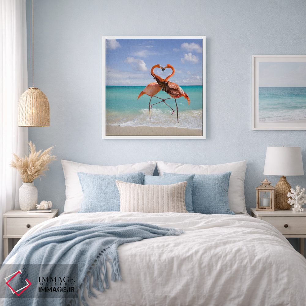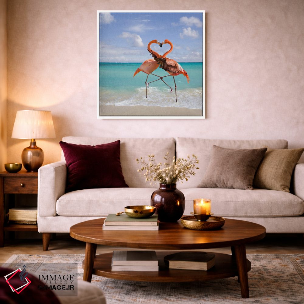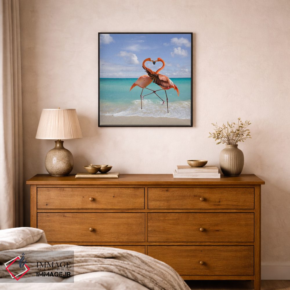 اگر میخواهید دیوار کمی سرزندگیِ محترمانه داشته باشد، «عشق فلامینگوها» اثرِ «لوند روزر» گرما و شخصیت به فضا اضافه میکند، برای دکورهایی با رنگهای خنثی گزینهٔ مناسبیست. به دیوار، قصه میدهد—اما قصهای آرام و شیک.