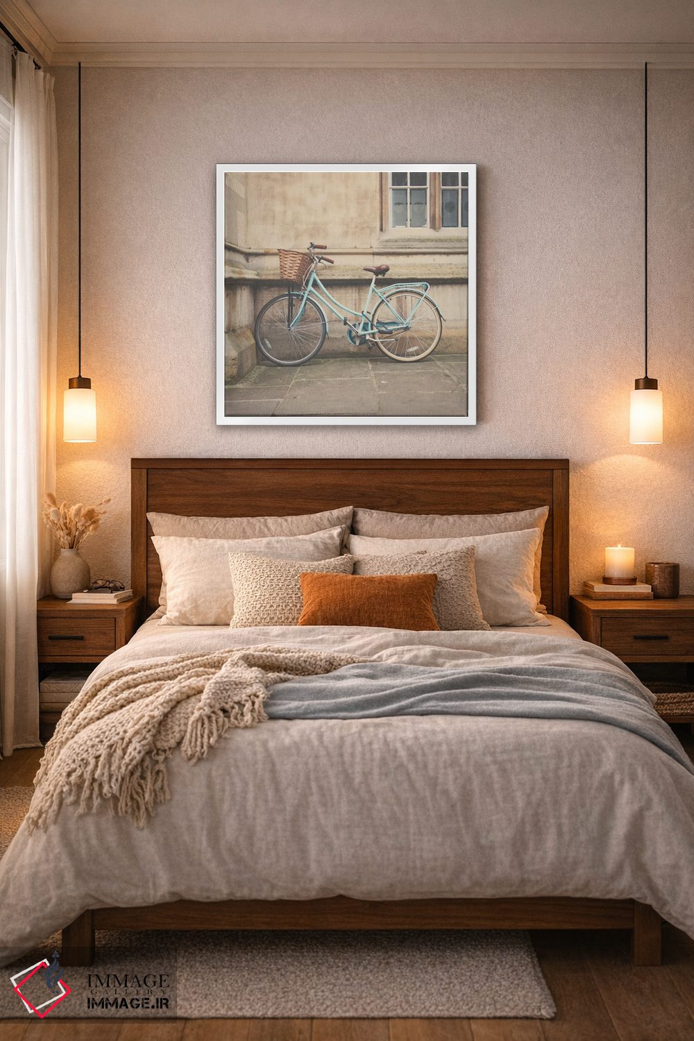 براساس پالت گرم اثر، قاب بلوط روشن (چوبی) پیشنهاد اول است و استخوانی ملایم مکمل. برای سفارشهای پروژهای با ابعاد و قابهای اختصاصی با ایماژ در تماس باشید.