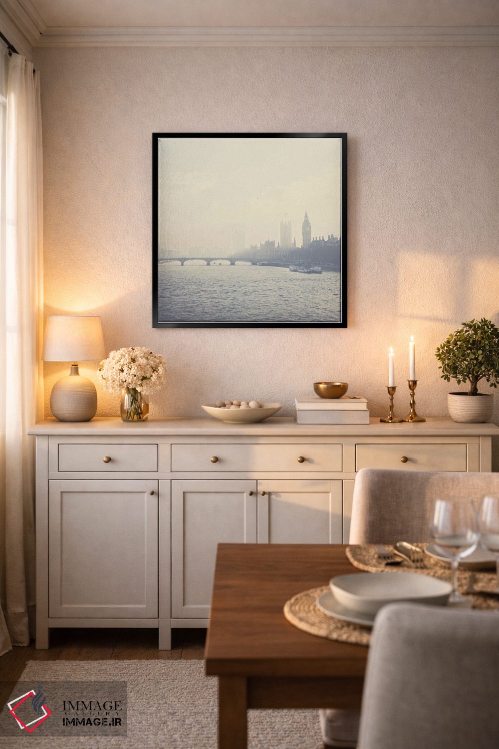 براساس پالت خنثی اثر، قاب بلوط روشن (چوبی) پیشنهاد اول است و استخوانی ملایم مکمل. برای سفارشهای پروژهای با ابعاد و قابهای اختصاصی با ایماژ در تماس باشید.