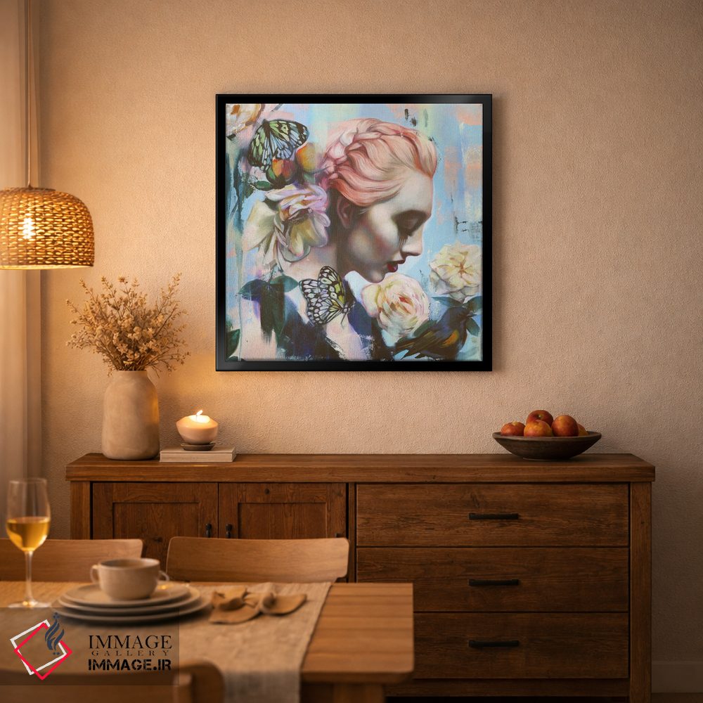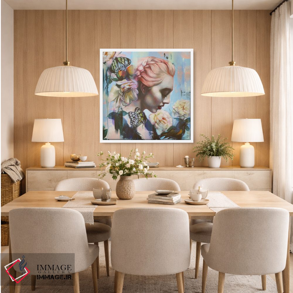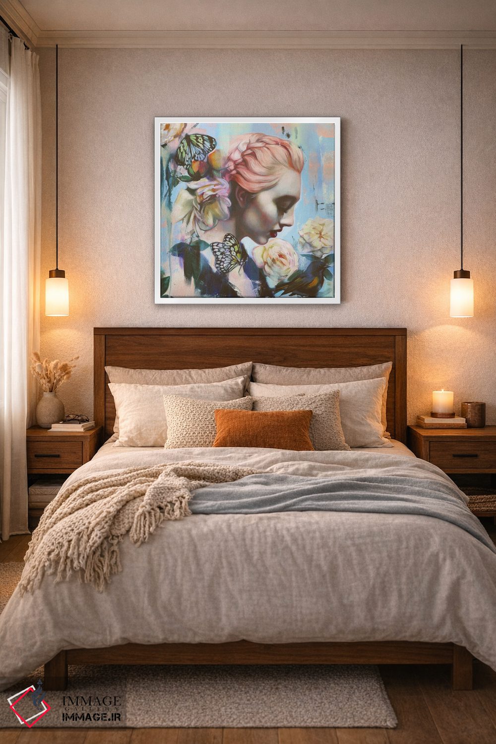 براساس پالت گرم اثر، قاب بلوط روشن (چوبی) پیشنهاد اول است و استخوانی ملایم مکمل. برای سفارشهای پروژهای با ابعاد و قابهای اختصاصی با ایماژ در تماس باشید.