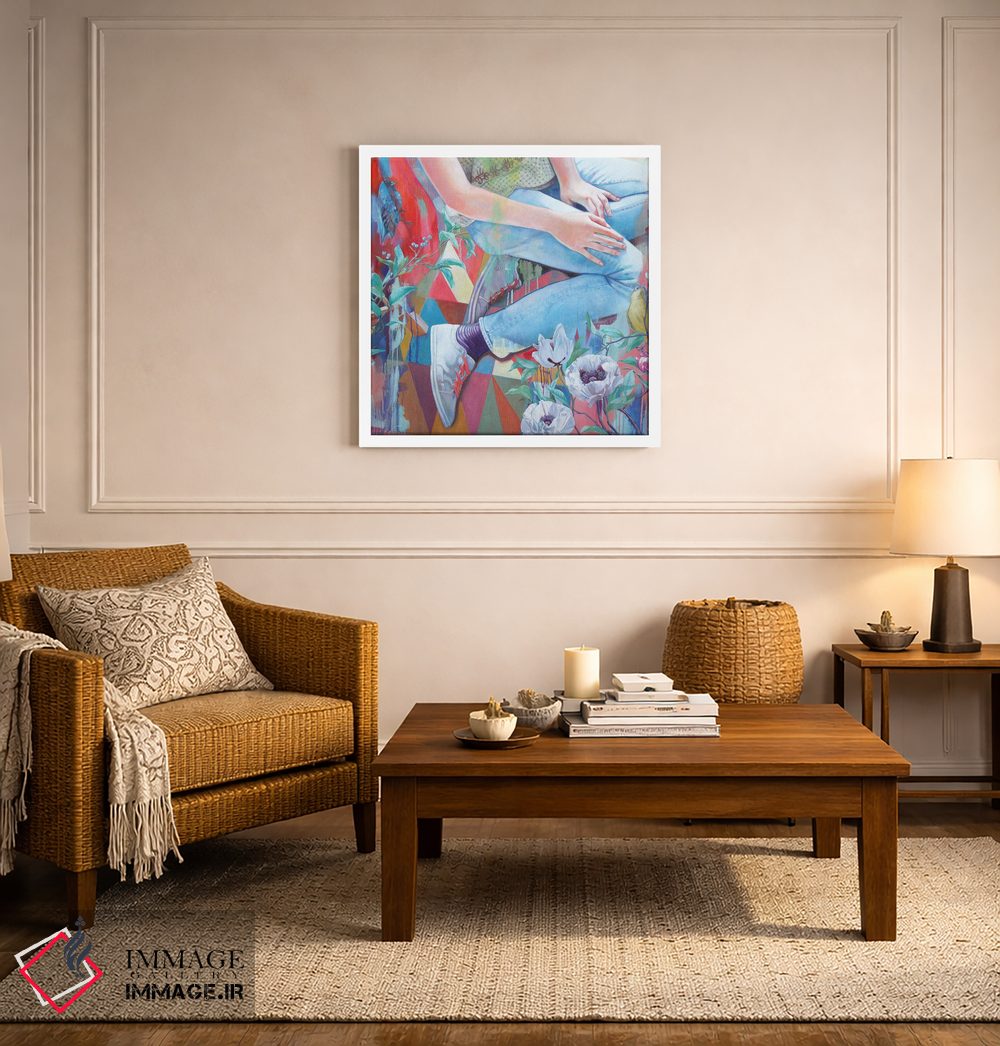 براساس پالت ترکیبی اثر، قاب تیک گرم (چوبی) پیشنهاد اول است و مشکی مات (فریم متوسط) مکمل. برای سفارشهای پروژهای با ابعاد و قابهای اختصاصی با ایماژ در تماس باشید.