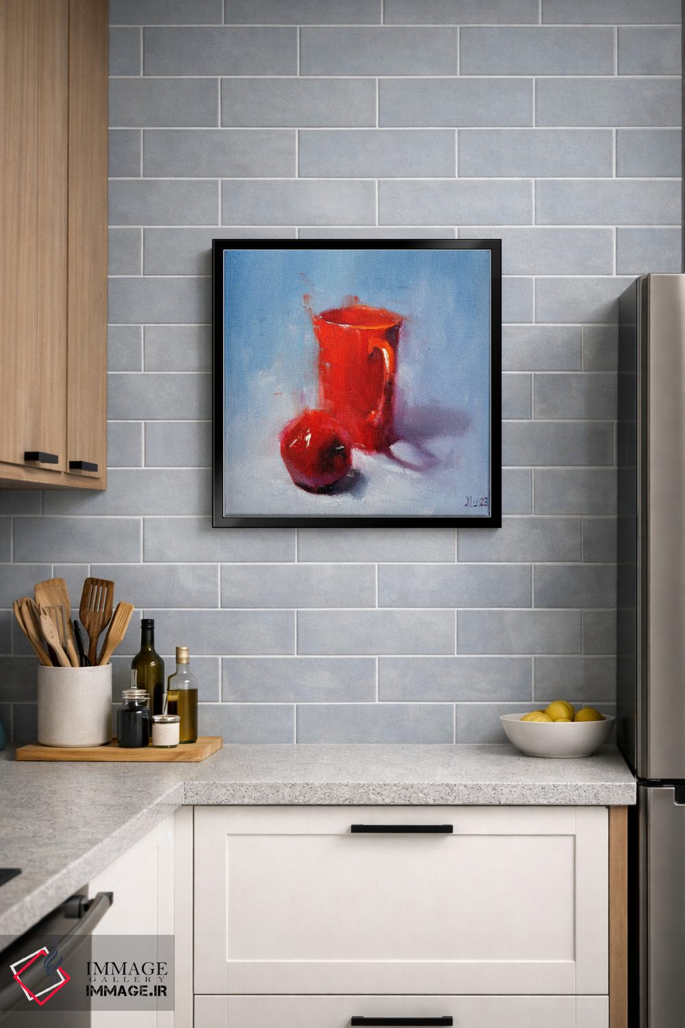 براساس پالت ترکیبی اثر، قاب تیک گرم (چوبی) پیشنهاد اول است و مشکی مات (فریم متوسط) مکمل. برای سفارشهای پروژهای با ابعاد و قابهای اختصاصی با ایماژ در تماس باشید.