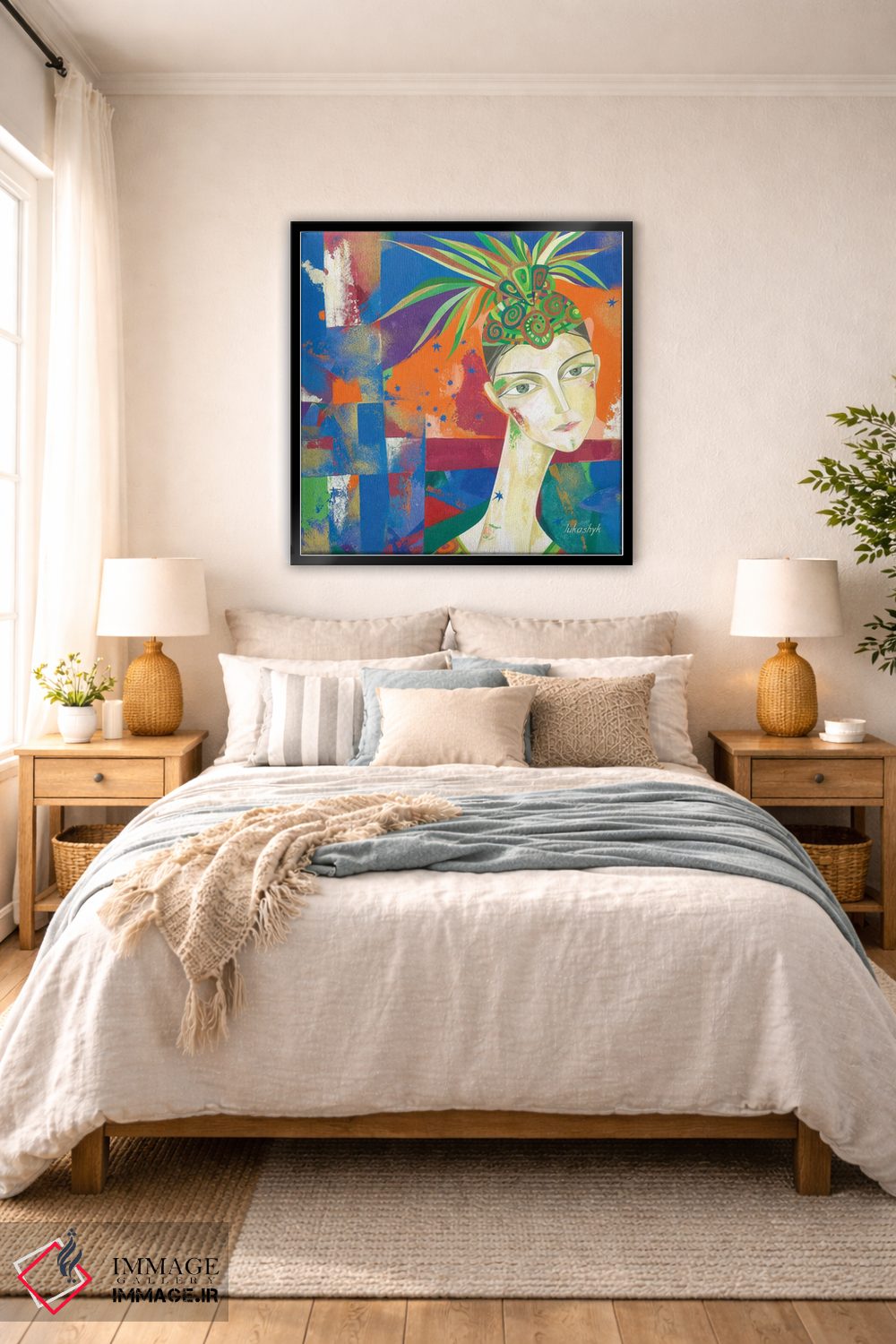 براساس پالت ترکیبی اثر، قاب تیک گرم (چوبی) پیشنهاد اول است و مشکی مات (فریم متوسط) مکمل. برای سفارشهای پروژهای با ابعاد و قابهای اختصاصی با ایماژ در تماس باشید.