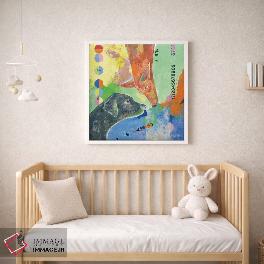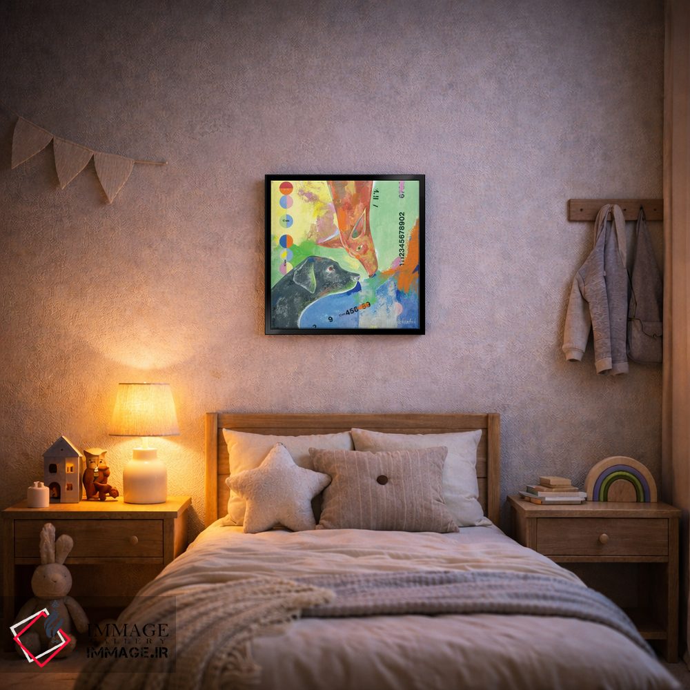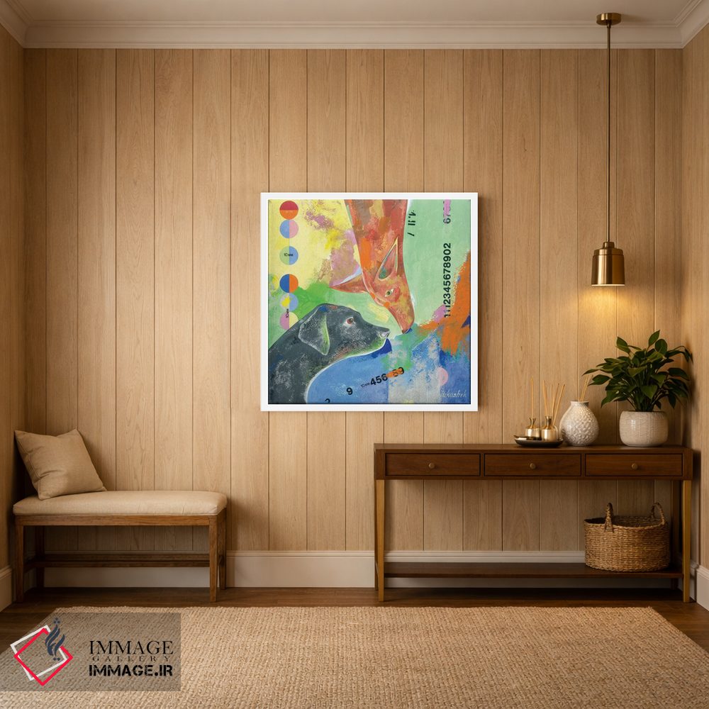 براساس پالت ترکیبی اثر، قاب تیک گرم (چوبی) پیشنهاد اول است و مشکی مات (فریم متوسط) مکمل. برای سفارشهای پروژهای با ابعاد و قابهای اختصاصی با ایماژ در تماس باشید.