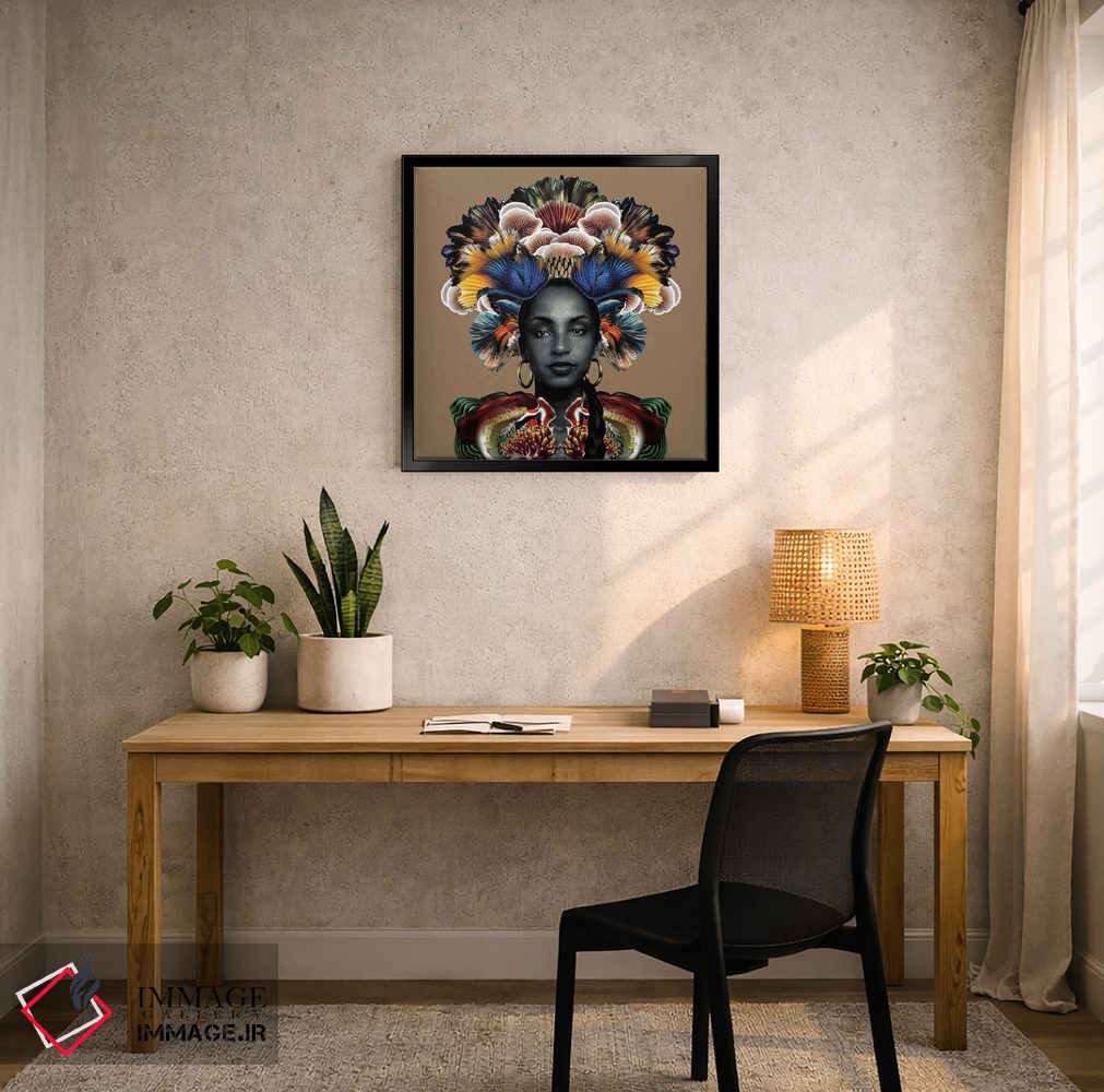براساس پالت ترکیبی اثر، قاب تیک گرم (چوبی) پیشنهاد اول است و مشکی مات (فریم متوسط) مکمل. برای سفارشهای پروژهای با ابعاد و قابهای اختصاصی با ایماژ در تماس باشید.