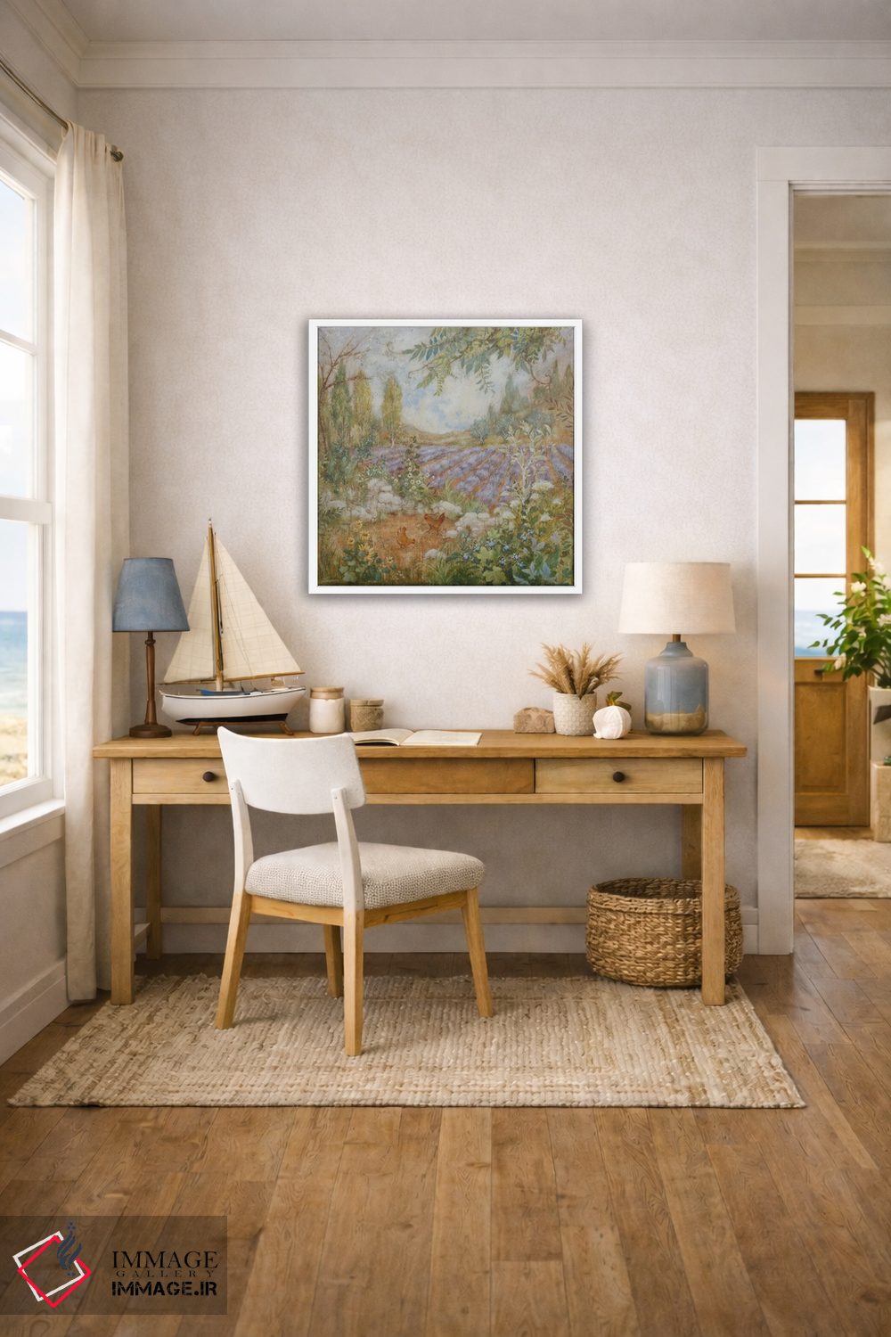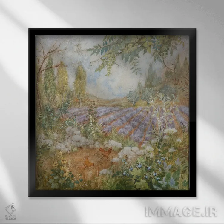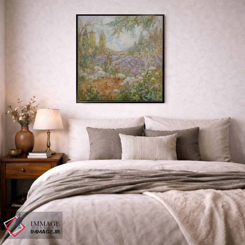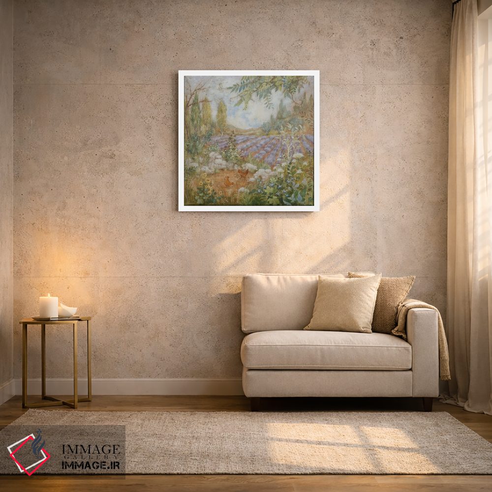 اگر به دکورهای طبیعی علاقه دارید، «مزرعه لاوندرها (فرانسه)» اثرِ «لیزا مری کیندلی» به دیوار، روشناییِ ملایم و دلنشین میدهد، برای نشیمنهای روشن گزینهٔ مناسبیست. حضورش آرام است، اما بیاثر نیست.