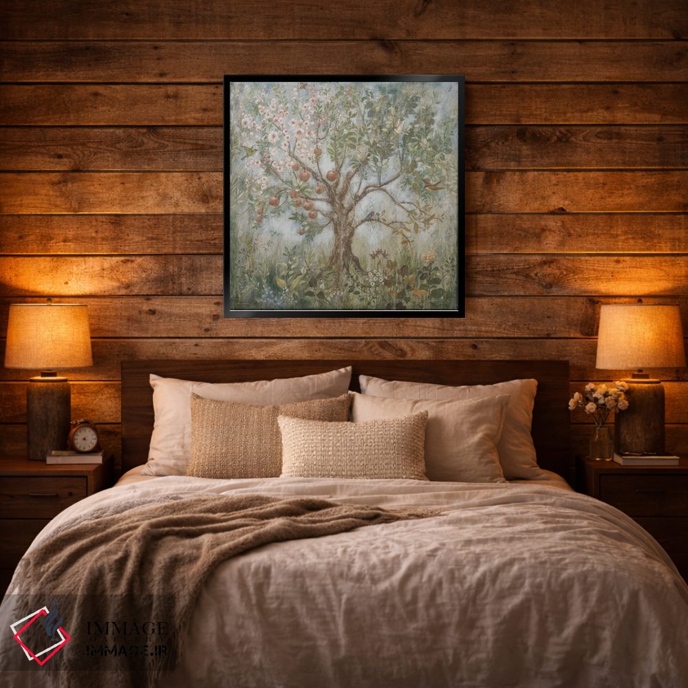 براساس پالت گرم اثر، قاب بلوط روشن (چوبی) پیشنهاد اول است و استخوانی ملایم مکمل. برای سفارشهای پروژهای با ابعاد و قابهای اختصاصی با ایماژ در تماس باشید.